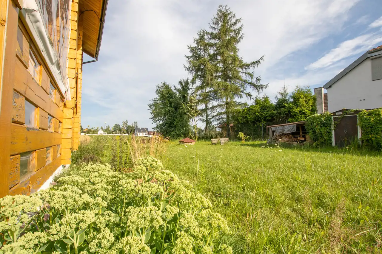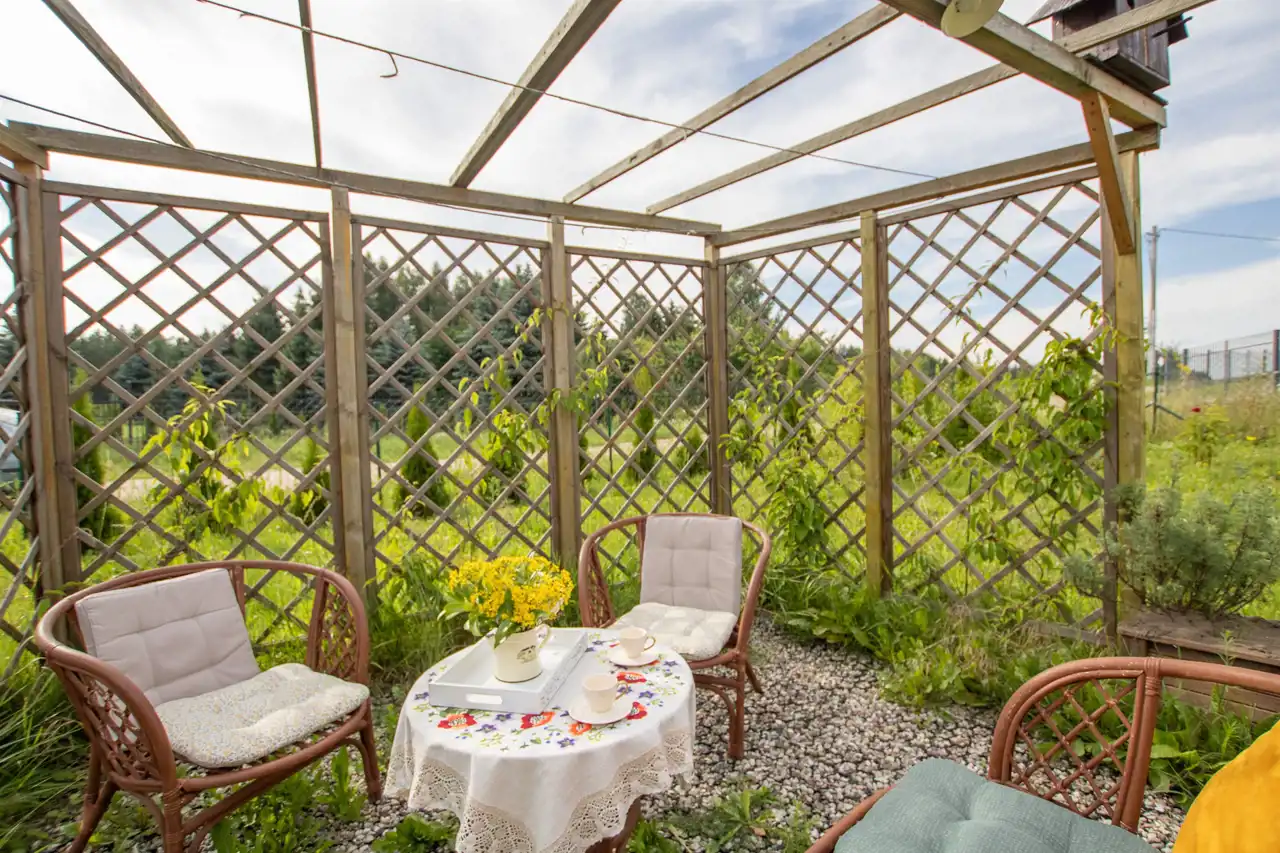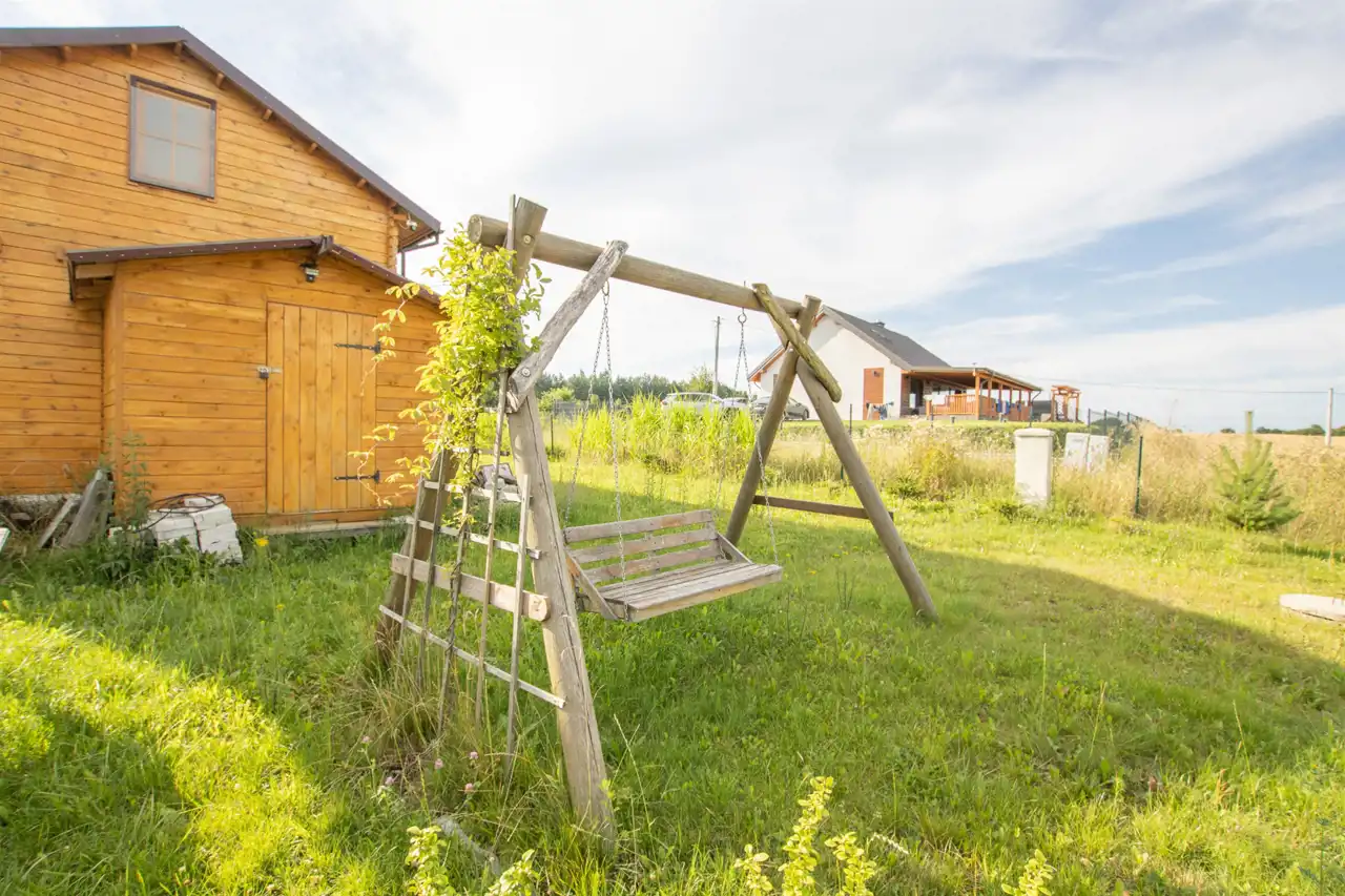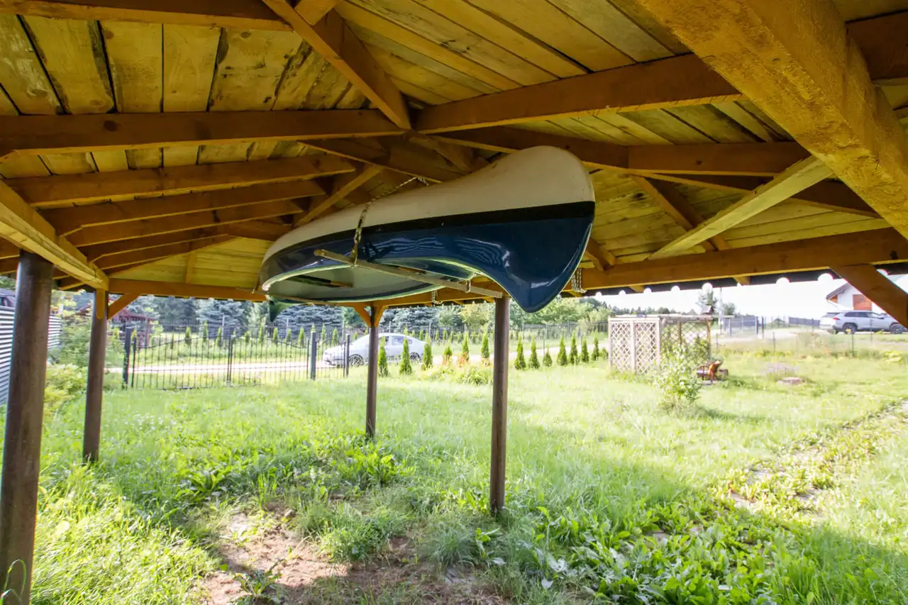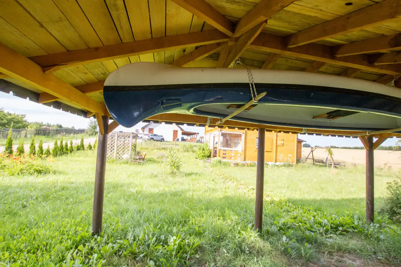 Przed domkiem, tuz obok polany, znajduje się niewielka altanka - drewniana, o ażurowej konstrukcji, która jest idealnym miejscem gdzie po prostu kawa smakuje lepiej. Na działce znajduje się wiata na auto, w którym również składowana jest łódka by w pełni korzystać z jeziora oraz plaży która znajduje się w odległości 250 m od domku. Również zbudowany jest składzik na narzędzia, kosiarki lub inne przydatne narzędzia które nie są estetycznym wyposażeniem domu.