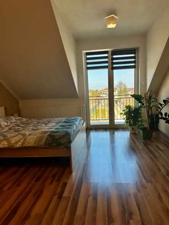 Piętro: 2 pokoje (wspólny balkon), sypialnia z garderobą i oddzielnym balkonem, łazienka