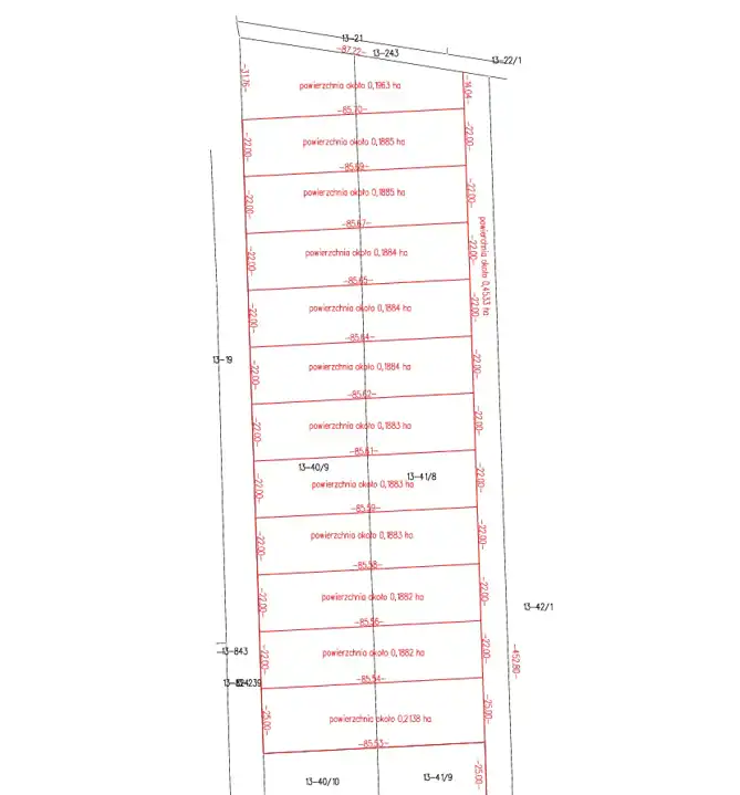 10 działek prostokątnych — ok. 22 × 85,5 m