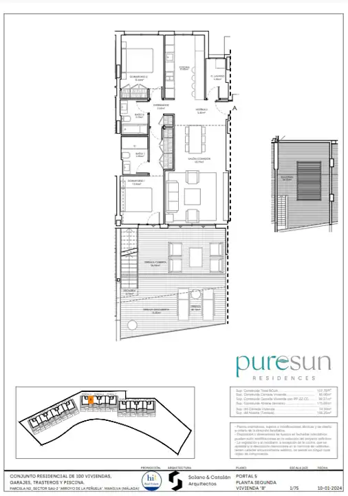 Pure Sun Residences to osiedle dwu- i trzypokojowych apartamentów w wspaniałej urbanizacji w niezwykłej lokalizacji. Projekt łączy nowoczesną architekturę z doskonale przemyślanym zagospodarowaniem terenu, który otacza budynek z rozległymi ogrodami i wspólnymi strefami rekreacyjnymi, które pozwalają klientowi cieszyć się koncepcją kurortu. Pure Sun będzie miało 159 mieszkań, z czego 50 w pierwszej fazie. Apartamenty zostały zaprojektowane z idealnym układem z dużymi przestrzeniami i tarasami zaprojektowanymi tak, aby były przedłużeniem domu. Orientacja osiedla i jego strategiczne położenie pozwalają, aby widoki i słońce były głównymi bohaterami tarasów. Jedną z najbardziej atrakcyjnych cech Pure Sun są widoki na morze: dzięki strategicznemu położeniu i konfiguracji osiedla projekt ten ma otwarte widoki na morze, od wschodu do zachodu słońca. W Pure Sun przestronne części wspólne zostały zaprojektowane tak, aby oferować szeroki wachlarz udogodnień, usług i rozrywki dla każdego. Lista elementów w tych obszarach została zaprojektowana tak, aby można było cieszyć się tym osiedlem mieszkaniowym bez względu na styl życia: - Baseny - Ogród - Solarium - Strefa chill out - Bar przekąskowy - Strefa relaksu na świeżym powietrzu - Siłownia wewnętrzna - Łaźnia turecka - Jacuzzi - Sauna - Strefa coworkingowa - Strefa zabaw w pomieszczeniu - Strefa multimedialna - Parking dla rowerów Każdy apartament ma duży taras, będący centralnym punktem całości, z przestronnym przedłużeniem nieruchomości z wspaniałymi widokami. Lokalizacja i otoczenie to kolejne z wielkich atrakcji Pure Sun, które oferuje niezrównane widoki na Morze Śródziemne. Zespół architektoniczny przeprowadził badanie otoczenia i lokalizacji, które wraz z idealnym stosunkiem powierzchni użytkowej do powierzchni użytkowej sprawiają, że te mieszkania są idealne. Ponadto Pure Sun oferuje szeroki zakres bezpłatnych opcji personalizacji, pogrupowanych w trzy kolekcje kolorów i materiałów: Earth Collection, Sea Collection i Air Collection, zaprojektowane tak, aby nadać Twojemu domowi idealne wykończenie dostosowane do Twojego gustu i stylu życia. PureSun znajduje się w Manilva (Malaga), wyjątkowej gminie pod względem lokalizacji, kultury i gastronomii, zaledwie kilka minut od najlepszych plaż na Costa del Sol i wszystkich usług. Jest to również idealne miejsce dla miłośników golfa. Zaledwie kilka minut stąd znajduje się pole golfowe La Duquesa, mniej niż 9 km od Estepona Golf, Doña Julia, Azata Golf i Valle Romano Golf, wszystkie z 18 dołkami i tylko 12 km od słynnego klubu golfowego Finca Cortesín.