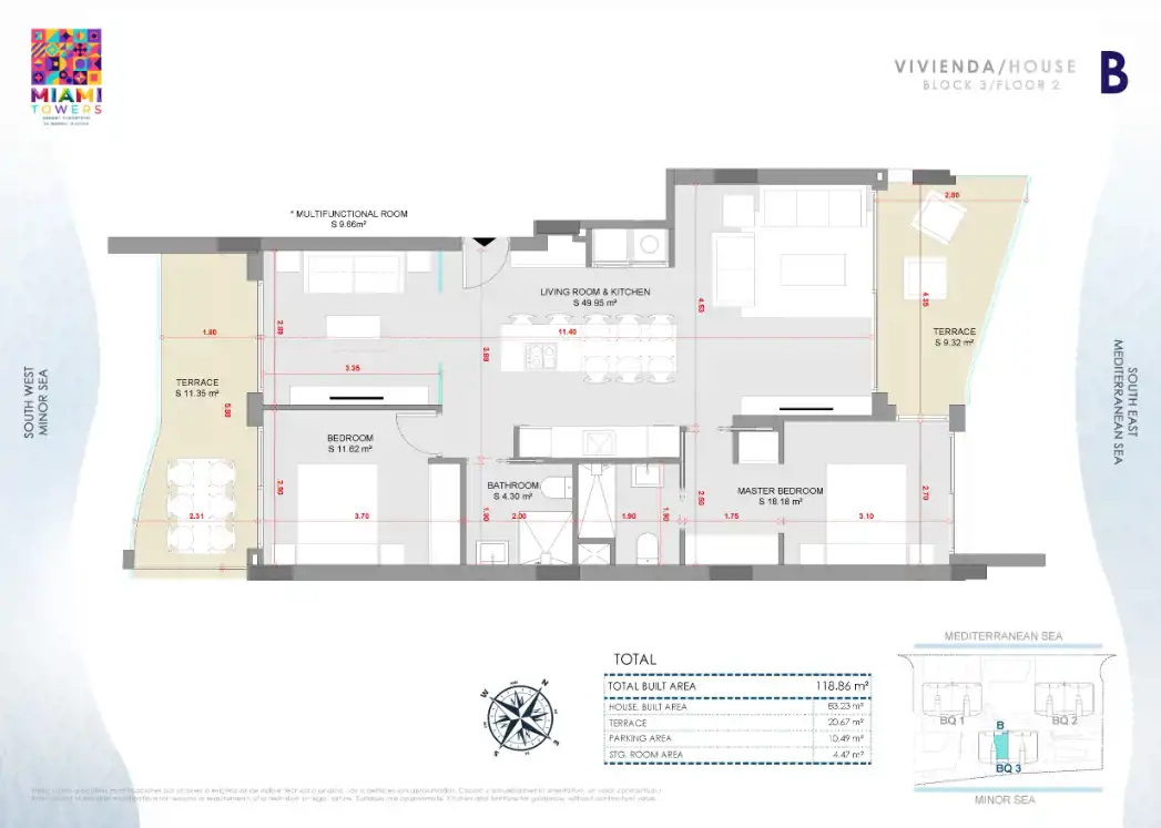 Miami Towers Spain to prestiżowy projekt mieszkaniowy, który harmonijnie łączy ekskluzywny design, luksusowe wnętrza i niesamowitą lokalizację nad morzem. Składający się z trzech dziesięciopiętrowych budynków kompleks oferuje 117 apartamentów o powierzchni około 120 m² oraz tarasy o powierzchni 25 m².