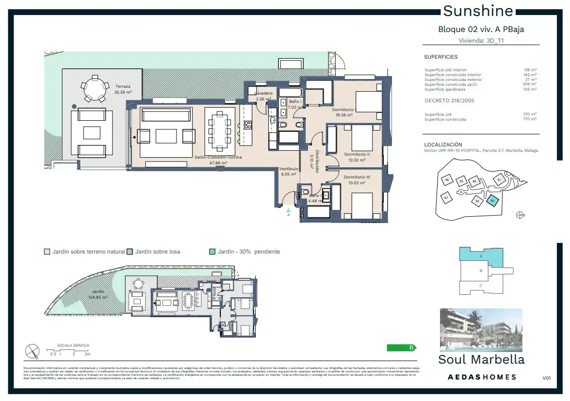 Dzięki podwyższonemu położeniu blisko morza, inwestycja oferuje niezwykłe widoki na pole golfowe oraz Morze Śródziemne. W ofercie znajdują się apartamenty z 2, 3 i 4 sypialniami, o powierzchni od 120 do 220 m², z możliwością łączenia mieszkań w większe jednostki o powierzchni użytkowej do 440 m².