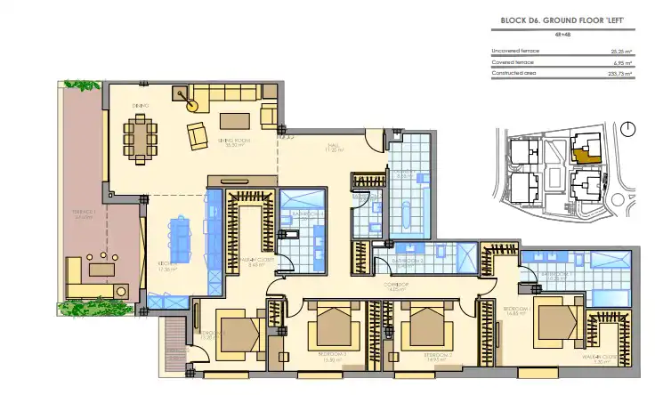 Wykończenia najwyższej jakości: apartamenty z dwiema, trzema i czterema sypialniami lub nieruchomości dwupoziomowe, w tym trzy, cztery lub pięć łazienek z pięknymi kafelkami w marmurowej armaturze w stylu śródziemnomorskim, wyposażone w wanny z hydromasażem, przestronne i spektakularne widoki z balkonów i tarasy, niektóre o powierzchni ponad 200 m2.