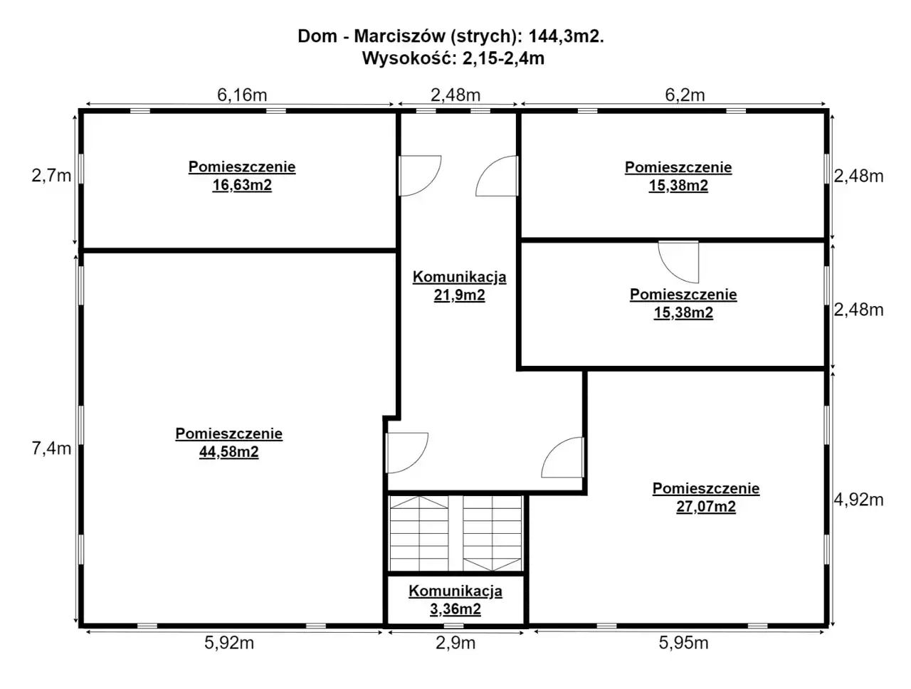 Poddasze (144,3 m2 wysokość pomieszczeń 2,15 m - 2,40 m)