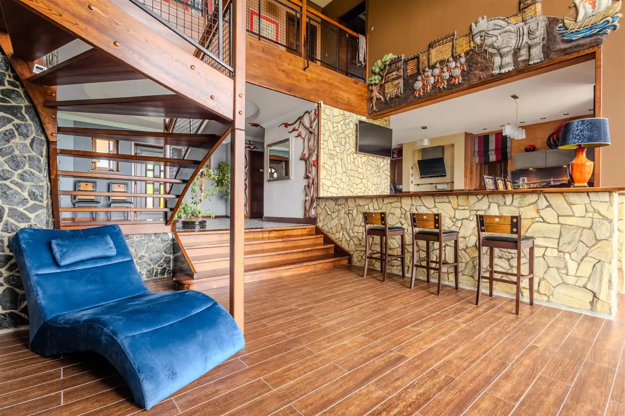 Układ parteru jest jednoprzestrzenny, otwarty, bez wydzielonych ścianami poszczególnych pomieszczeń. Jedyne pomieszczenie zamknięte to wc oraz wydzielone zejście do piwnicy.
