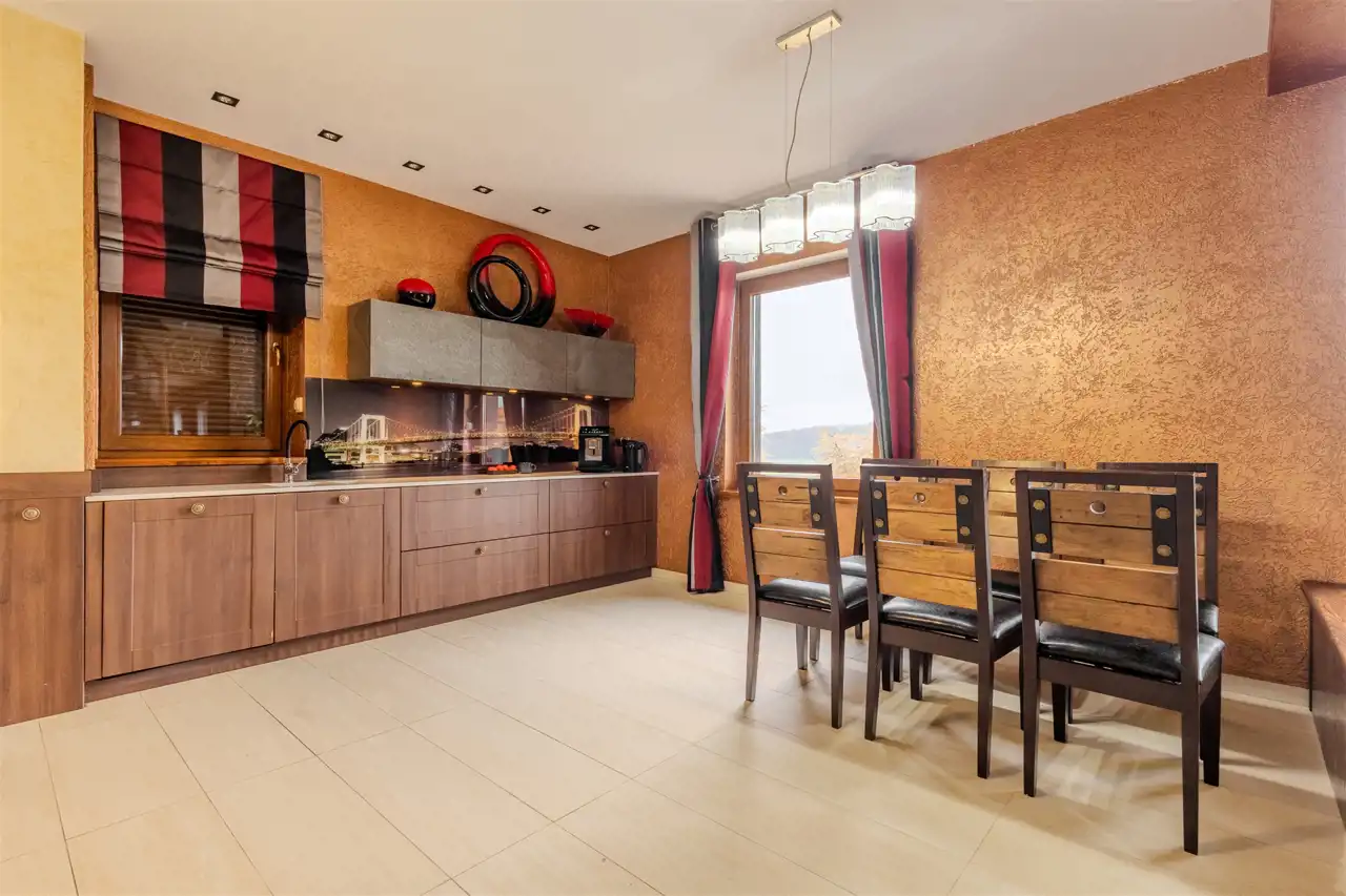 Przestrzeń użytkowa domu została podzielona na 6 pokoi, 2 łazienki, 1 garderobę, kuchnie, holl, garaż, pralnia oraz pomieszczenie gospodarcze w piwnicy. Całe wyposażenie kuchni dobrane zostało z dbałością o najwyższy standard i klasą sprzętów AGD.