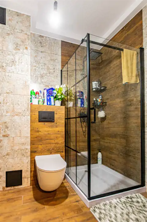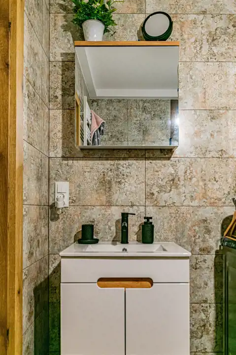 W łazience duża kabina prysznicowa, umywalka z szafką i lustrem, wc i grzejnik drabinka.