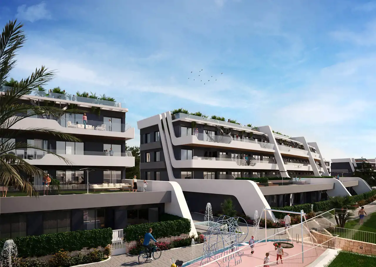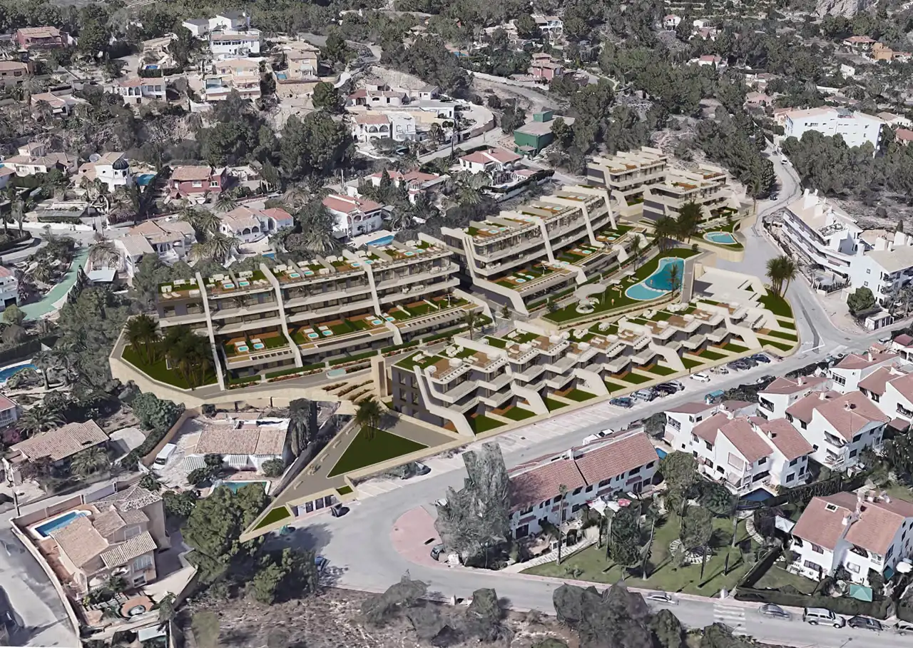 Nowe osiedle apartamentów posadowionych na zboczu góry, z oszałamiającym panoramicznym widokiem na morze, góry i zieloną okolicę.