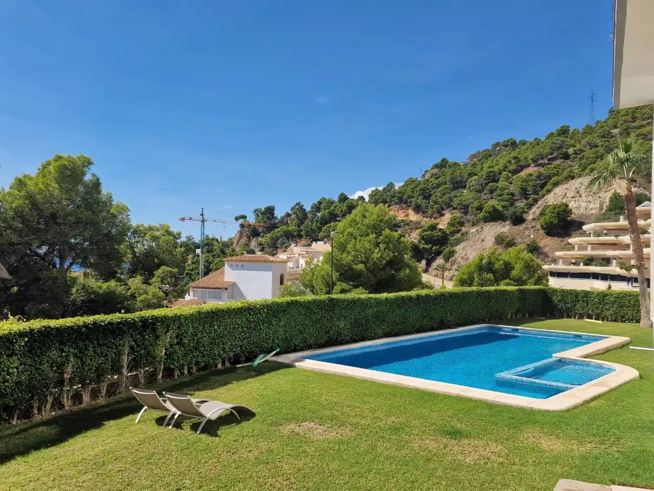 Apartament w kameralnym budynku, położony na wysokim parterze w Altea, Costa Blanca. Powierzchnia 87m2 na którą skłają się 2 sypialnie, 2 łazienki kuchnia połączona z jadalnią i salonem. Do nieruchomości należy również bardzo duży taras o powierzchni aż 68m2 z widokiem na Morze Śródziemne. Świetna lokalizacja, 400m do plaży, na terenie obiektu wspólny basen.