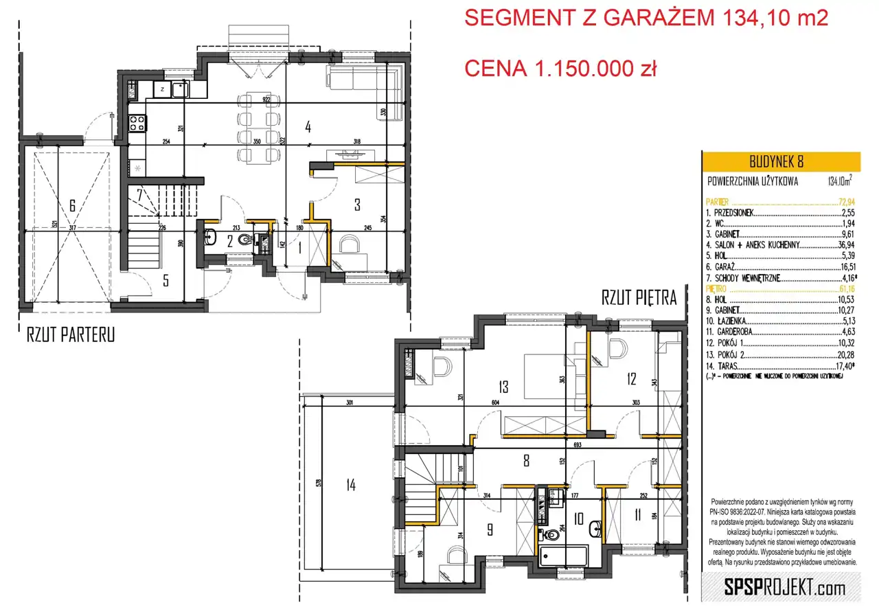 - segment dwupoziomowy z garażem o powierzchni 134,10 m2 w cenie 1150000 zł.