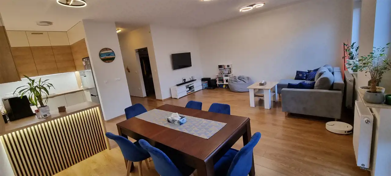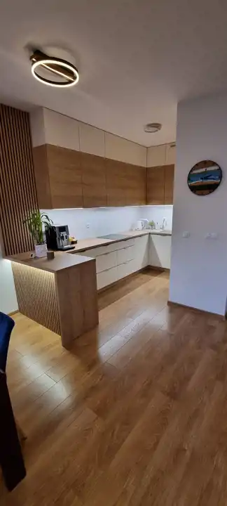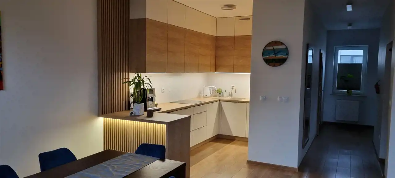 Salon z aneksem kuchennym (37 m²): Duża, otwarta przestrzeń, która łączy strefę relaksacyjną z jadalnią i nowoczesną dużą zabudową kuchenną zrobioną na wymiar, z półwyspem, wykończoną materiałami wwysokiej jakości (fronty i korpusy Acrillux Niemann laminat Egger, zawiasy Blum, szuflady Blum Antaro, półki narożne LeMans, servo-drive uno Blum w szufladzie pod zlewem). Ogrzewanie podłogowe w kuchni. Idealne miejsce do wspólnego gotowania, które dzięki idealnej aranżacji nie odcina od przestrzeni dziennej z innymi domownikami czy gośćmi. Panelepodłogowe laminowane wodoodporne Dąb Leonardo AC5 8 mm na całym piętrze (oprócz łazienki), pod którymi zastosowaniu porządny podkład wygłuszający, listwy przypodłogowe drewnopodobne. Eleganckie i oryginalne oświetlenie sufitowe nadaje stylu i dopełnia pomieszczenie.