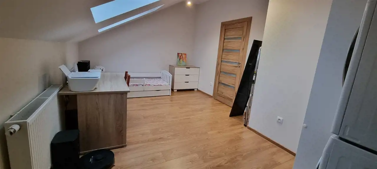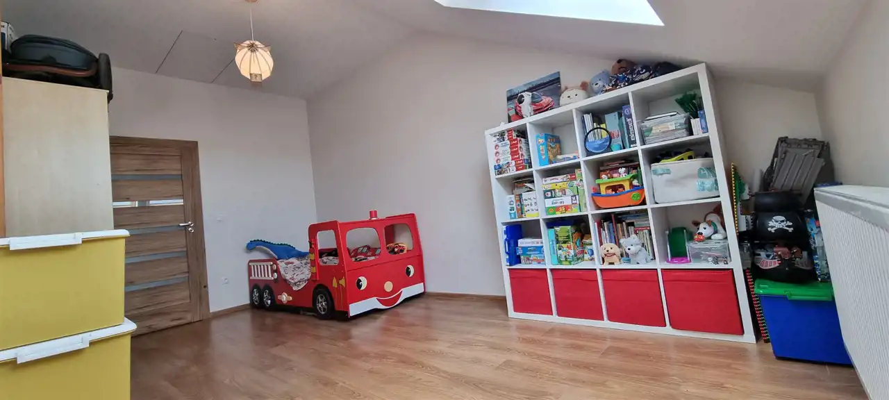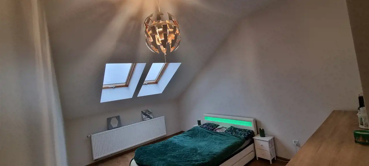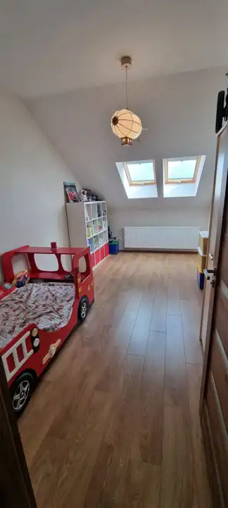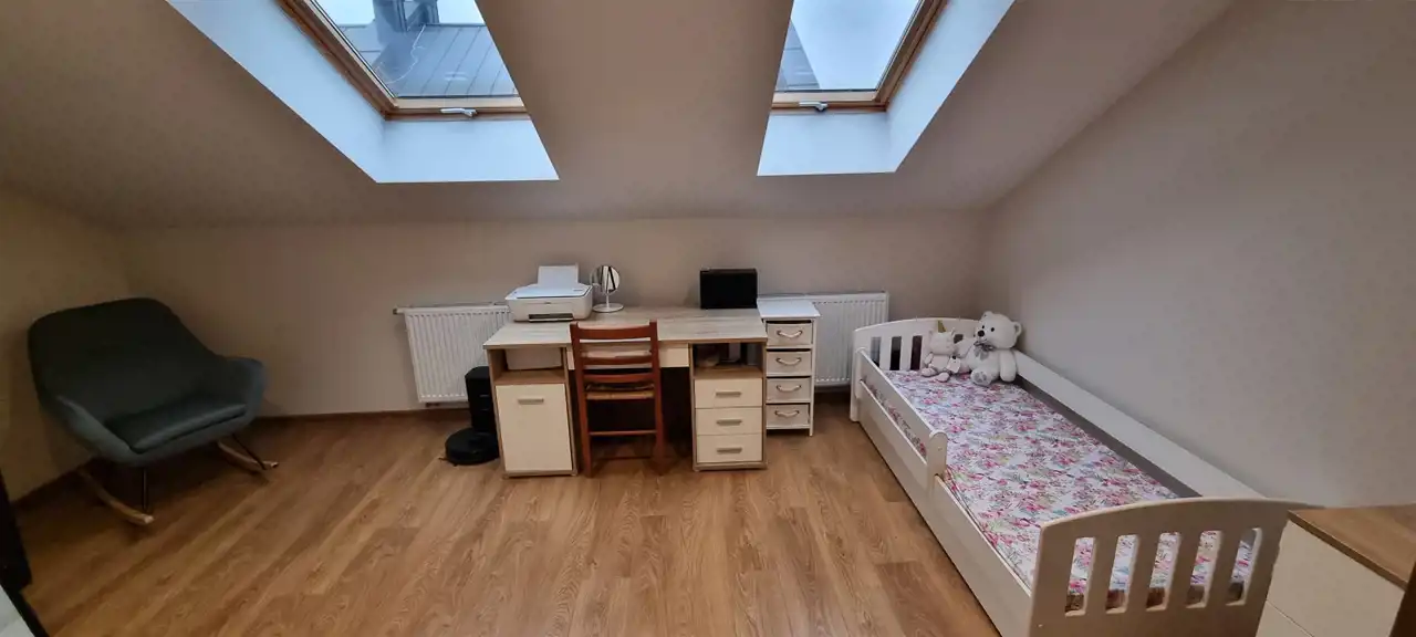 • Pokój 1 (13,33 m²): Jasny pokój z dużymi oknami dachowymi Velux, z listwami zaciemniającymi, z wyłazem na strych (ok. 20 m² dodatkowej przestrzeni do przechowywania rzeczy), schody strychowe Fakro z łatwym mechanizmem otwierania i zamykania.1. Pokój 2 (12,07 m²): Kolejny wysoki i jasny pokój z przestronnymi oknami Velux, z listwami zaciemniającymi. Wysokość w najwyższym punkcie to 280 cm, co umożliwia ustawienie dużych mebli.