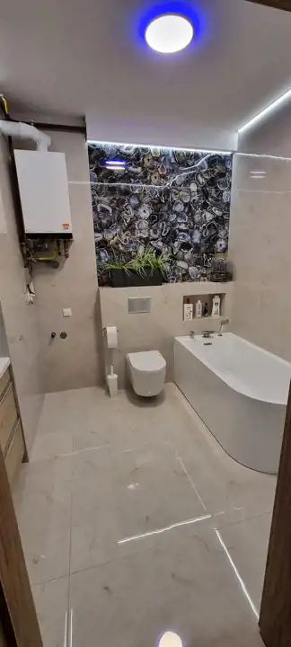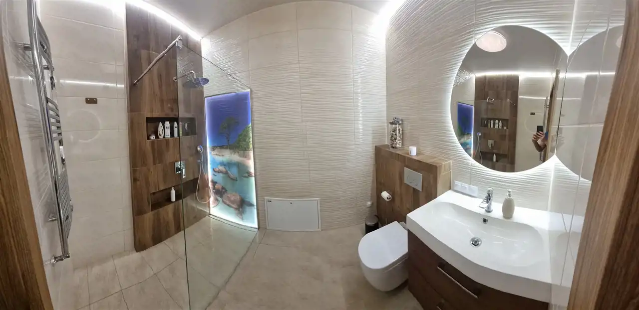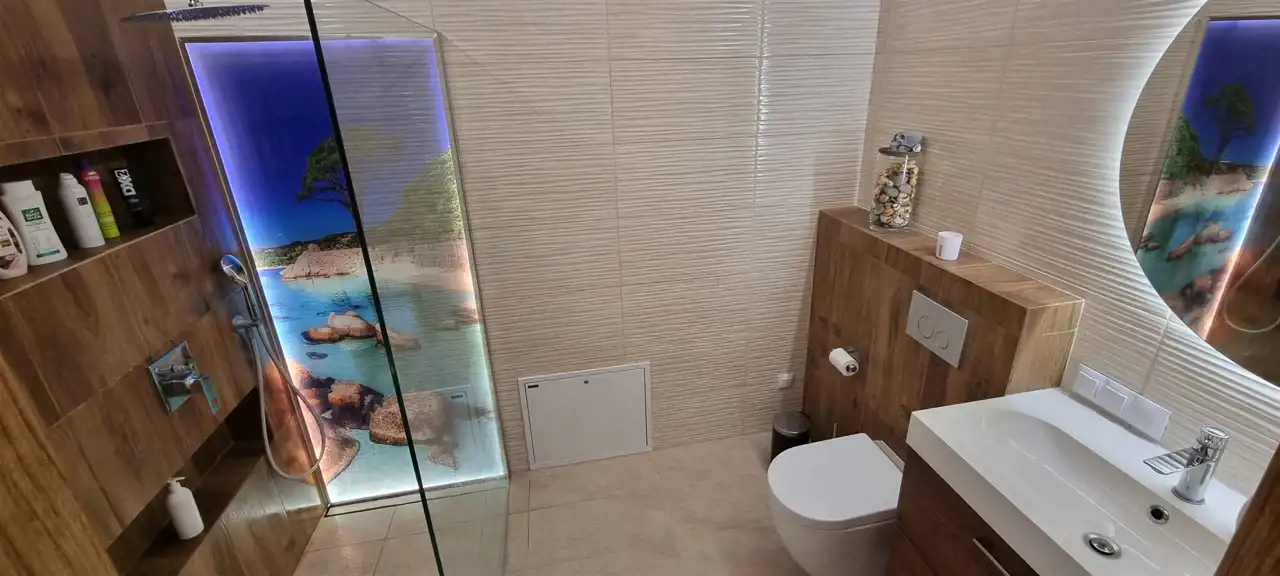 3. Łazienka II (5,02 m²): Nowoczesna łazienka w stylu inspirowanym chorwackimi wakacjami. Płytki imitujące piasek, duży prysznic 120 cm typu Walk-In, zestaw podtynkowy Geberit zabudowany pięknymi płytkami, szklany panel z piękną grafiką plaży i morza, z podświetleniem led, szafka wisząca z pojemnymi szufladami, lustro podświetlane o kształcie półkoła i oświetlenie z regulowanym natężeniem światła (które daje możliwość dostosowania do pory dnia).