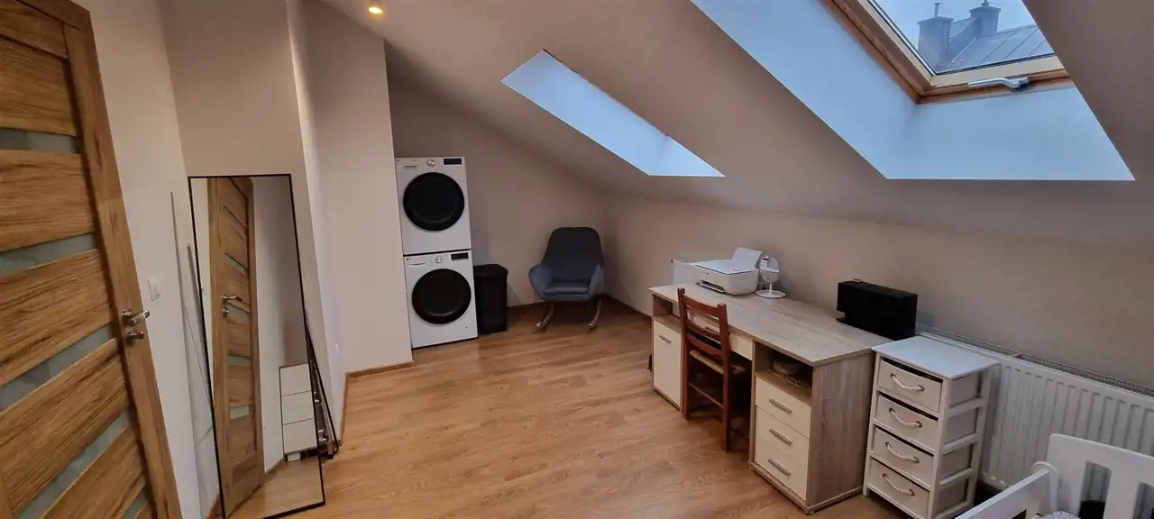 2. Pokój 3 (10,50 m²): Pokój również z dużymi oknami Velux, z listwami przyciemniającymi, wyposażony w dodatkowe przyłącza do internetu, wody i odpływu, co umożliwia zamontowanie pralki i suszarki (także w pionie, jedna na drugiej).