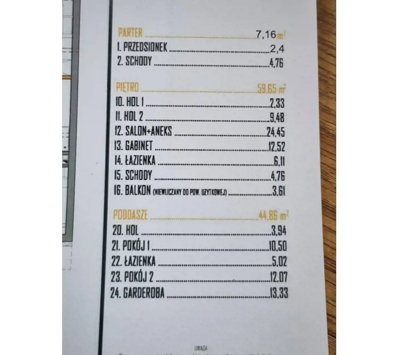 • Poddasze: 44,86 m² (pow. Użytkowa; 59,65 m² po podłodze; 3 pokoje, hol, łazienka)