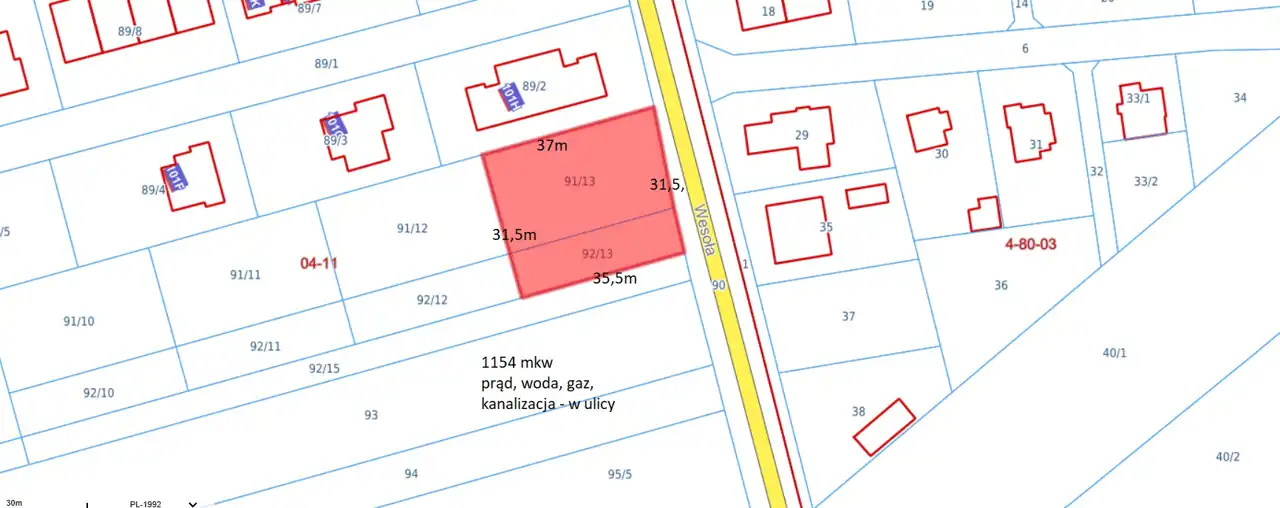 - Media Woda: w ulicy; Kanalizacja: w ulicy; Prąd: w ulicy; Gaz: w ulicy