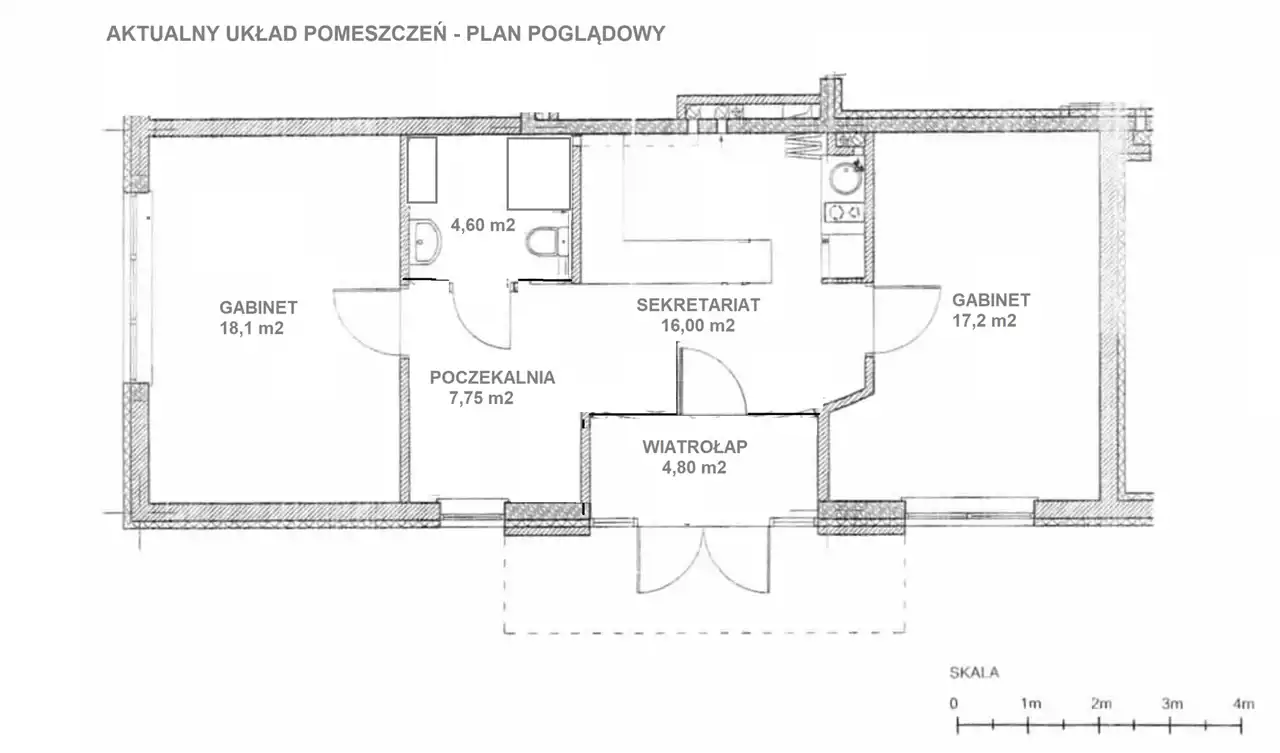 Lokal składa się z wiatrołapu, poczekalni, sekretariatu z aneksem kuchennym, dwóch gabinetów oraz łazienki.