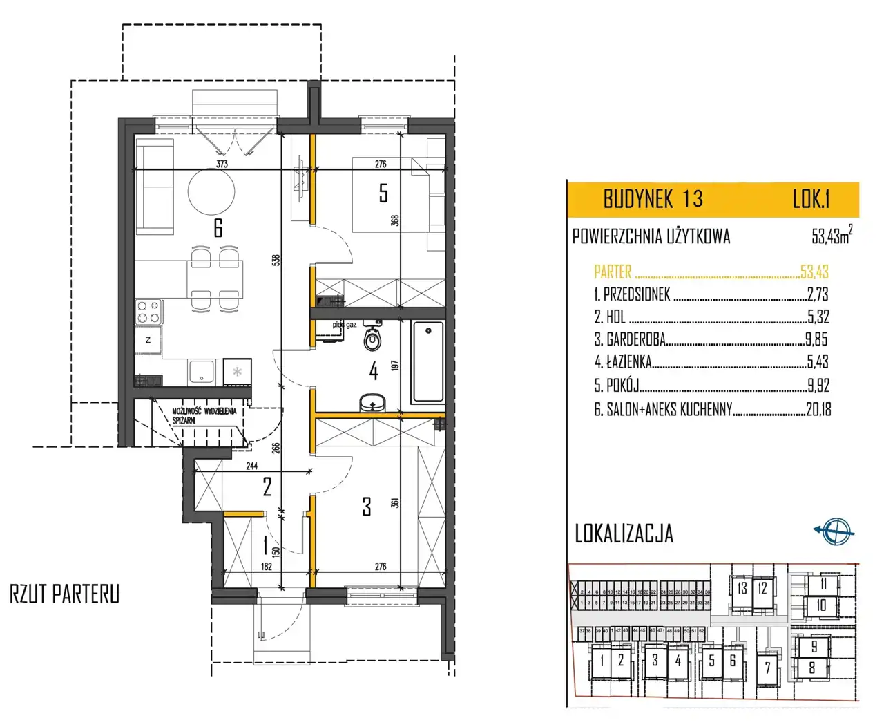 - Charakterystyka mieszkania 53.43 m2, 3 pokoje