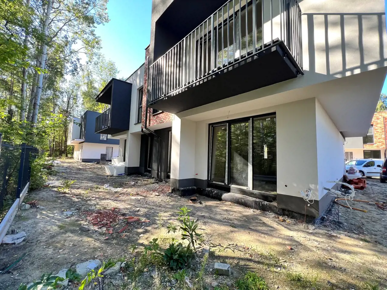 STANDARD: lokale oddawane w stanie deweloperskim. Wszystkie media miejskie: gaz, prąd, woda, kanalizacja. Ściany zewnętrzne wykonywane z bloczka ceramicznego typu Owczary Termoton gr. 19cm, ściany dylatacyjne wykonywane z bloczka ceramicznego typu Owczary Termoton gr. 2x19cm, ściany działowe (silikat, gazobeton lub ceramika) gr 12cm. Strop nad parterem i I piętrem żelbetowy. Wykończenie ścian wewnętrznych – tynki gipsowe. Tynki zewnętrzne –silikonowe na ociepleniu ze styropianu grubości 15cm.Stolarka okienna –PCV 6 komorowe, trzyszybowe. Stolarka drzwiowa – drzwi wejściowe stalowe z elementami przeszklenia. Balustrady ze stali – ocynkowane i malowane. Ogrodzenie posesji, brama na pilota, płotki odgradzające ogródki z tyłu budynków. Kostka betonowa i kostka eko w ciągu pieszo–jezdnym oraz miejsca parkingowe przed budynkami. Ogródek do wyłącznego korzystania zakratkowany na Planie Zagospodarowania Terenu wraz z miejscami postojowymi. Ogrzewanie i ciepła woda – z pieca gazowego, kocioł gazowy dwufunkcyjny,z zamkniętą komorą spalania, ze sterowaniem i wyprowadzeniem spalin przewodem powietrzno-spalinowym przez dach budynku. Grzejniki wraz z zaworami termostatycznymi w mieszkaniu. Ogrzewanie podłogowe w głównej łazience i kuchni, wg projektu. Woda z projektowanych przyłączy z sieci miejskie. Ścieki z projektowanych przyłączy z sieci miejskiej. Instalacja elektryczna: przewody miedziane, instalacja wykonana puszkami łączeniowymi, okablowanie do ewentualnej instalacji alarmowej. Instalacja gazowa. Przyłącze elektryczne do budynku ziemne. Instalacje: RTV, alarmowa, domofonowa. Rozprowadzenia do instalacji klimatyzacji w salonie wg odrębnego projektu technicznego. Schody zewnętrzne żelbetowe w stanie surowym oraz balkony w stanie surowym do własnej aranżacji. Stropodach żelbetowy – izolowany styropianem i pokryty papą zgrzewalną.