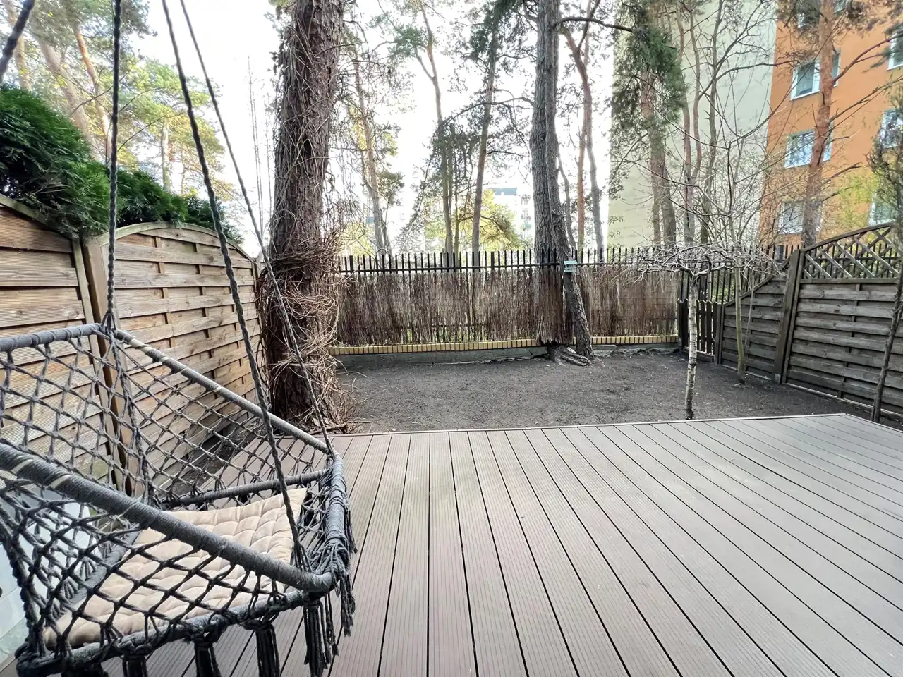 Z salonu wyjście na wyłożony deską z kompozytu taras i teren zielony. Idealne miejsce do odpoczynku.