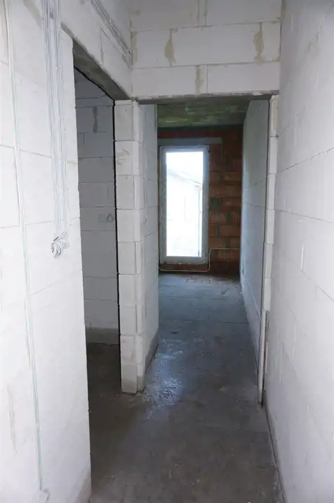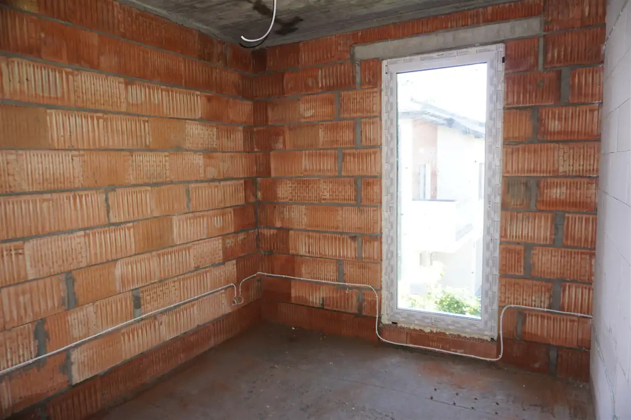 Dach płaski , tynki gipsowe , posadzki cementowe, ogrzewanie podłogowe: w łazience + aneks kuchenny, okna PCV 3 szybowe, drzwi antywłamaniowe, piec dwu-funkcyjny + w pozostałych pomieszczeniach grzejniki.