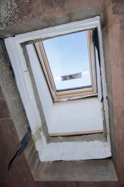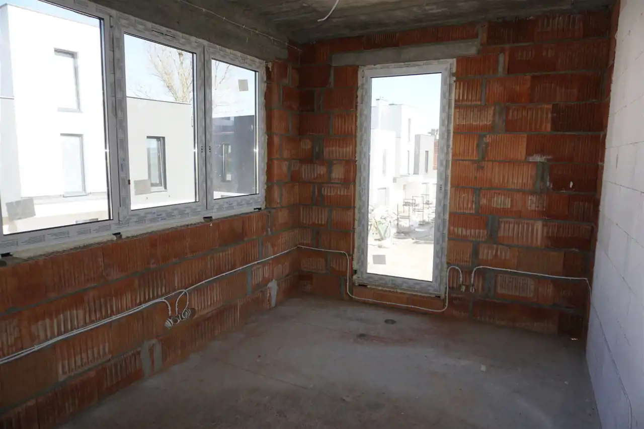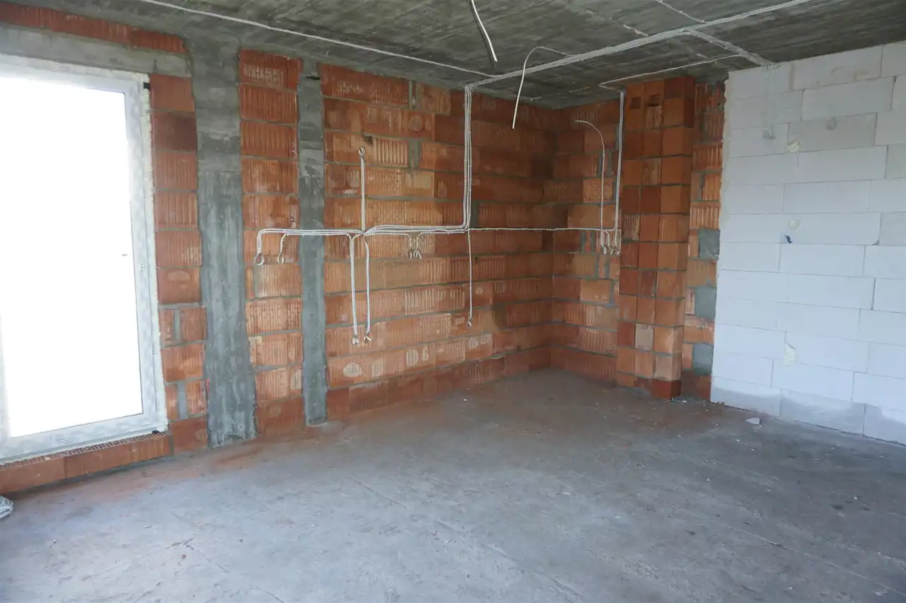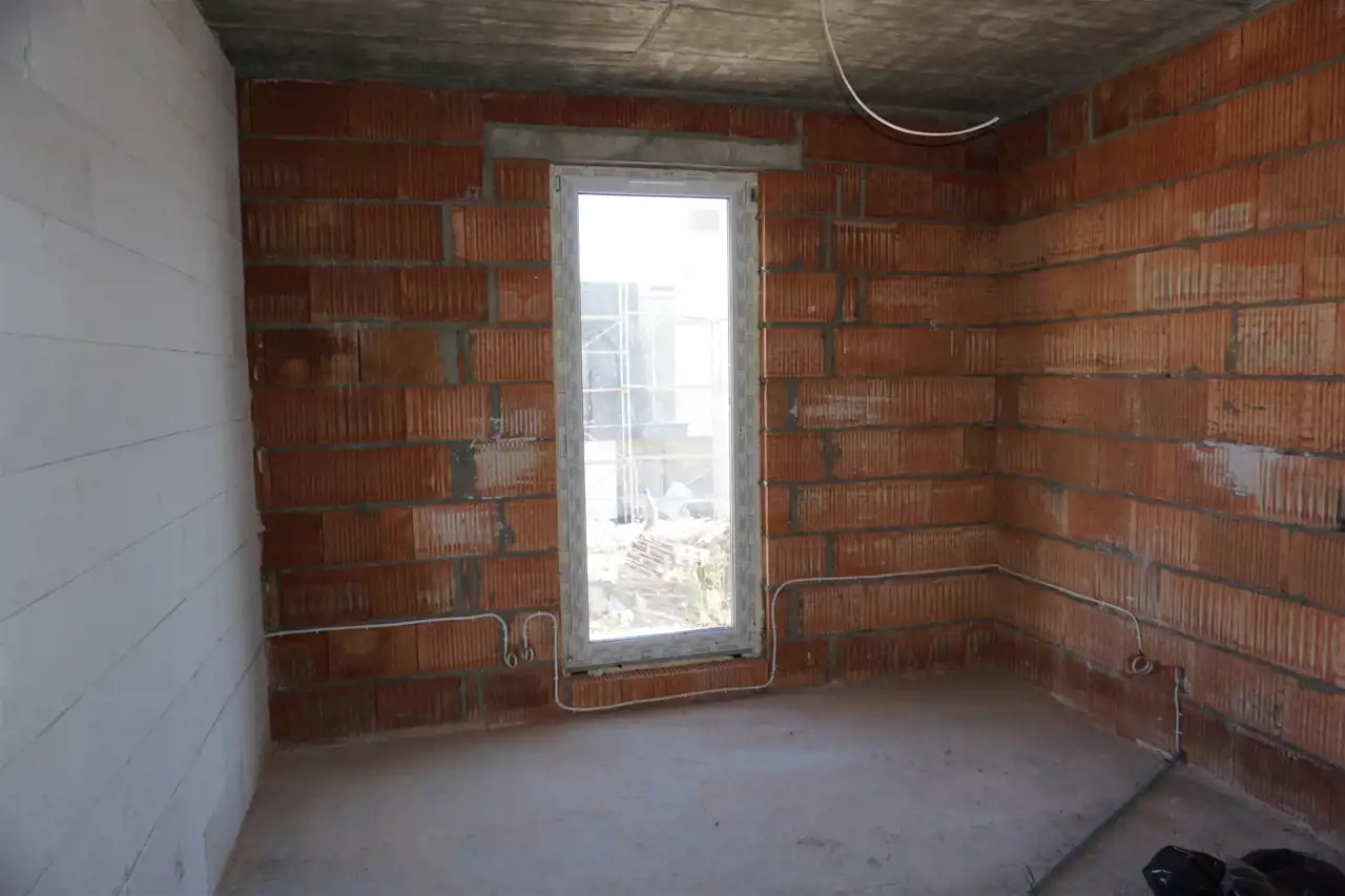 Dach płaski , tynki gipsowe , posadzki cementowe, ogrzewanie podłogowe: w łazience + aneks kuchenny, okna PCV 3 szybowe, drzwi antywłamaniowe, piec dwu-funkcyjny + w pozostałych pomieszczeniach grzejniki.