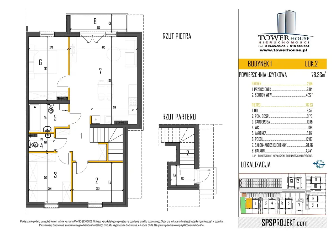 Na piętrze: salon z aneksem kuchennym (28,76 m2 ) z wyjściem na balkon (~4,74 m2), pokój ( 12,07 m2), garderoba ( 10,15 m2), pomieszczenie gospodarcze ( 9,78 m2) łazienka ( 5,07 m2 ), WC (1,94 m2), hol (6,52 m2).