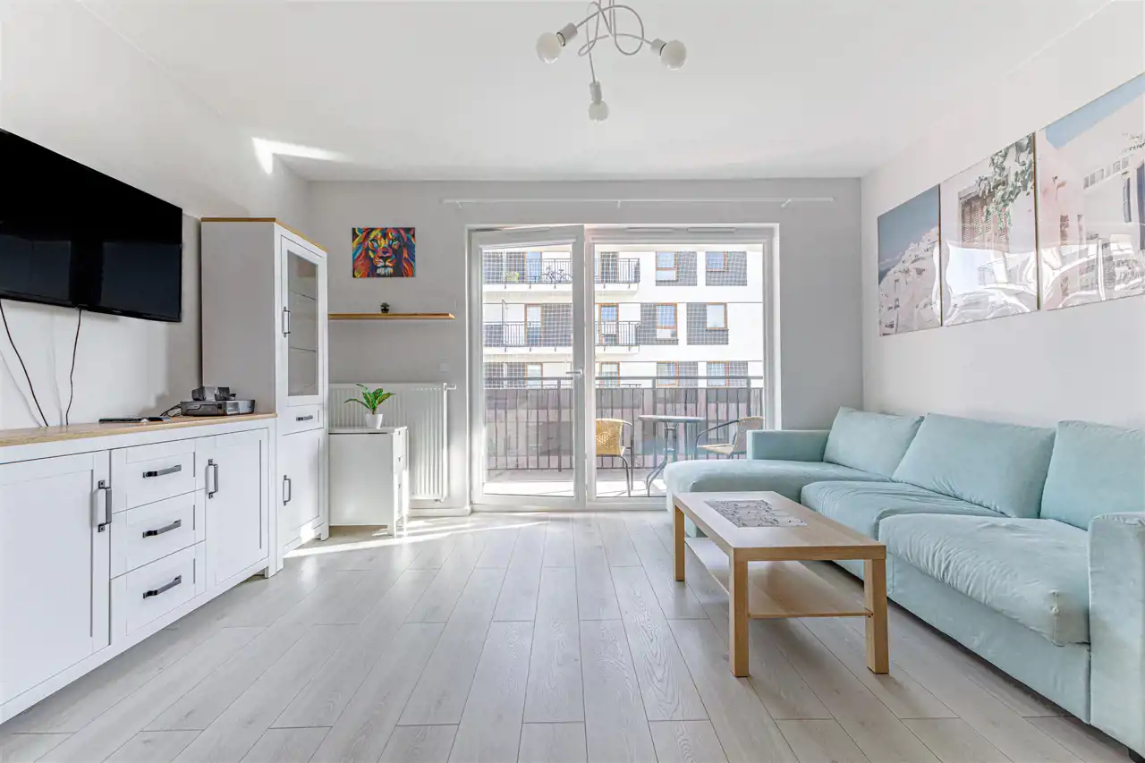 - Salon: duży wygodny narożnik z funkcją spania, stół, stolik, telewizor, komoda, regał;