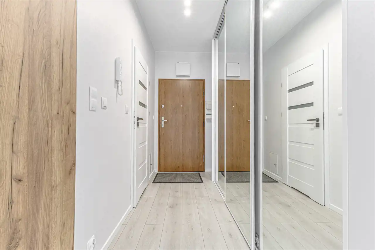 - Przedpokój: wieszaki na ubrania, duża szafa w zabudowie;