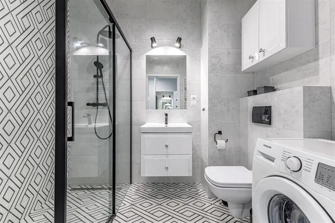 - Łazienka: duża kabina prysznicowa, umywalka, wc, szafka, pralka;
