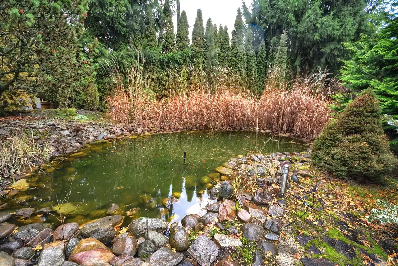 The property is situated on a fenced, landscaped plot of 2,023 m². The land is partially paved with cobblestones and features numerous trees, shrubs, and a decorative pond.