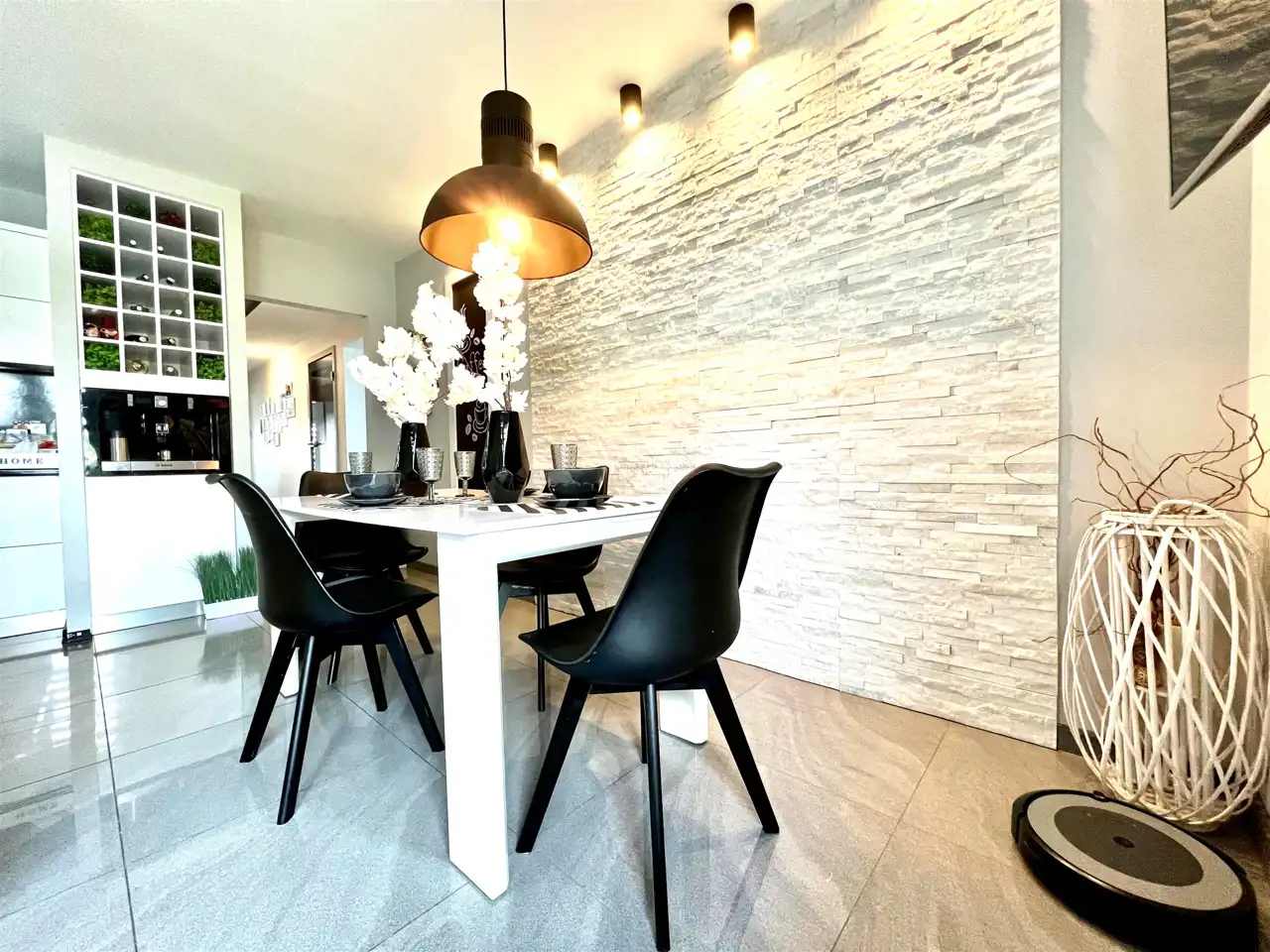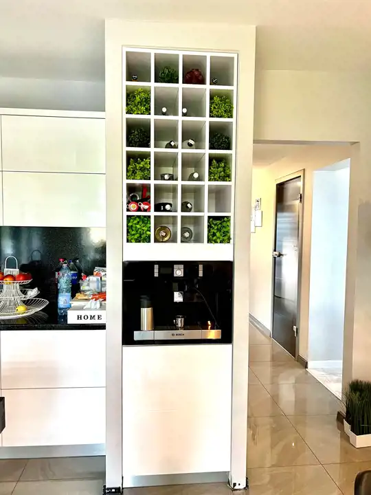 Zostały tam użyte materiały wysokiej klasy tak jak kamienie naturalne typu granit czy też marmur oraz wysokiej jakości sprzęt AGD (lodówka z kostkarką, zabudowany Express do kawy marki Bosch, piekarnik i mikrofalówka marki Samsung).