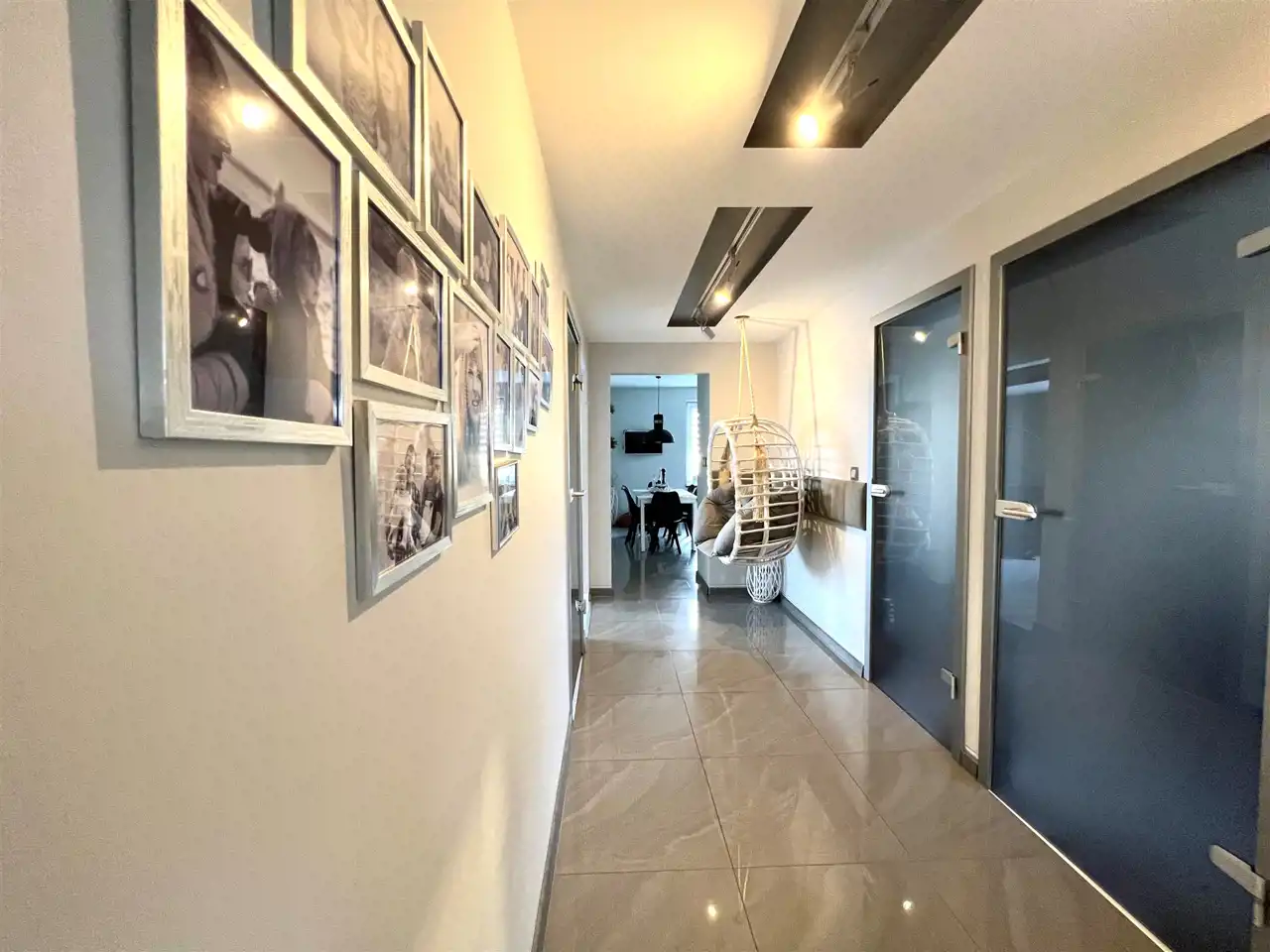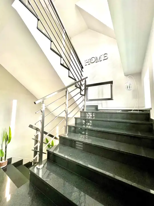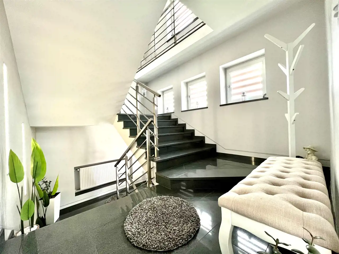Na piętra prowadzą efektowne granitowe schody z piękną nowoczesną poręczą. Wchodząc zarówno na piętro pierwsze i jak i drugie mamy do dyspozycji salon, dwie sypialnie, łazienkę oraz kuchnię połączona z jadalnią jak również obszerny holl.