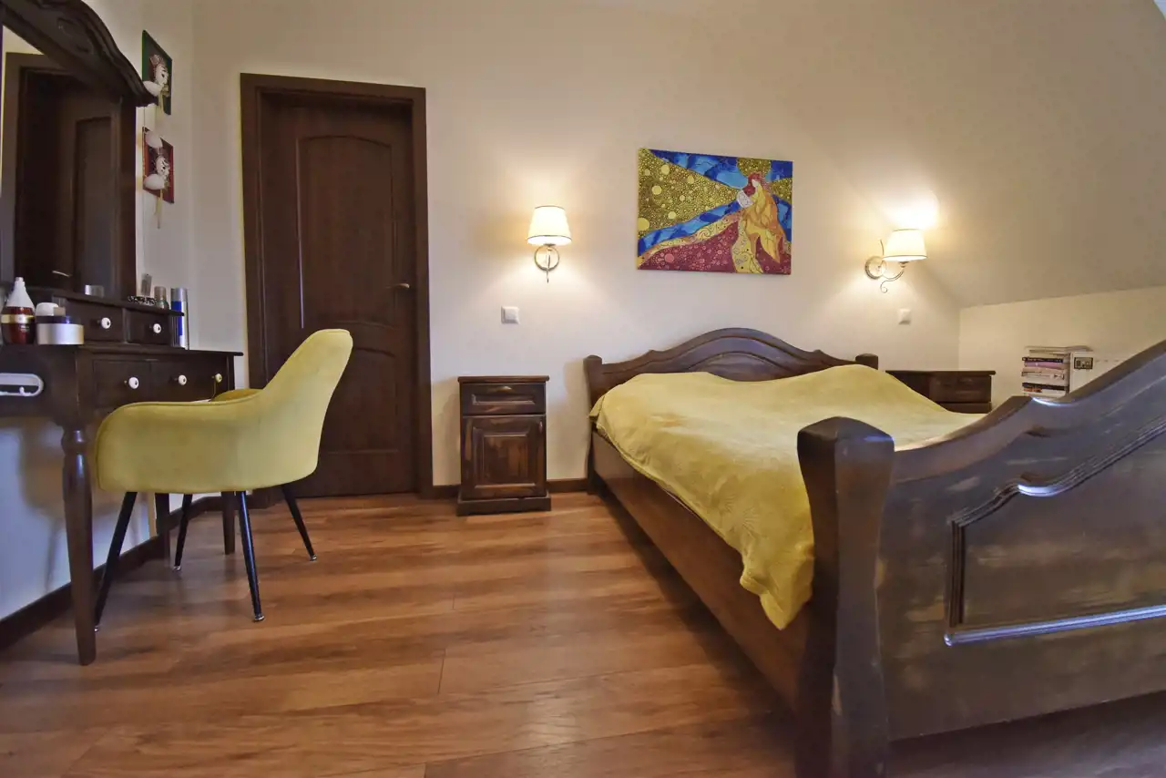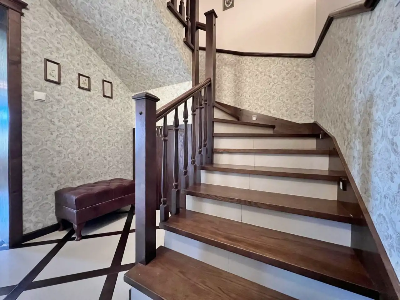 The house was built in 2017 using high-quality materials with masonry technology. It's insulated with a 15 cm thick layer of styrofoam, has a ceramic tile roof, triple-glazed PVC windows, and concrete stairs covered with wood. The ground floor has underfloor heating, and the first floor has it in the bathroom. A notable feature is the sauna in the main bathroom.