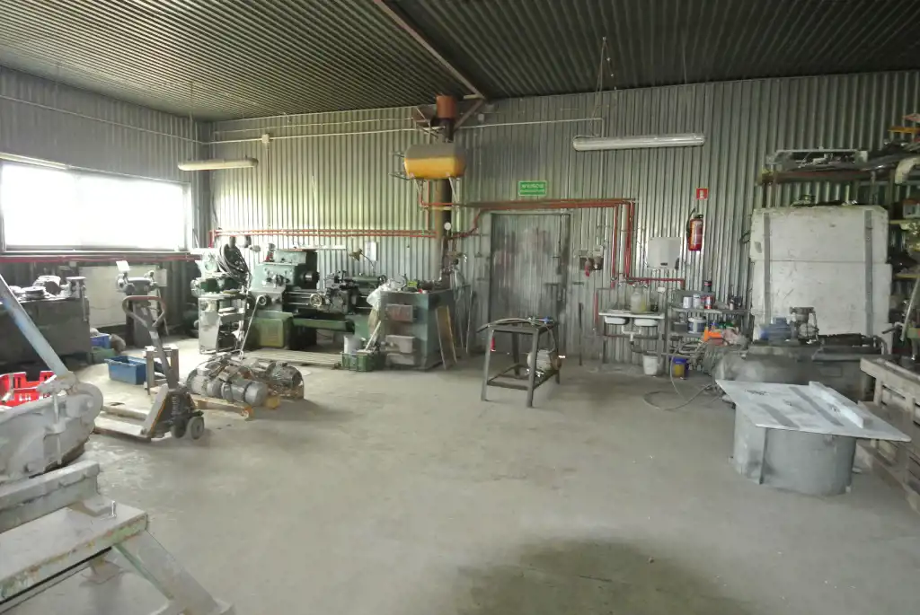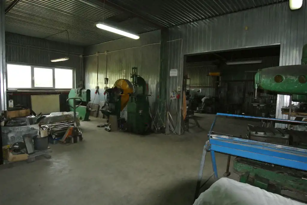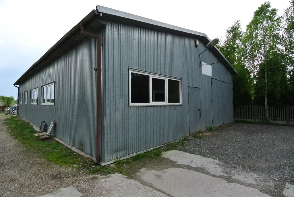 The hall has an area of approximately 214 sqm, is made of sheet metal, and has a concrete floor. The hall's height is 3.6 meters, and the entrance gate measures 2.9 meters (height) x 3.9 meters (width).