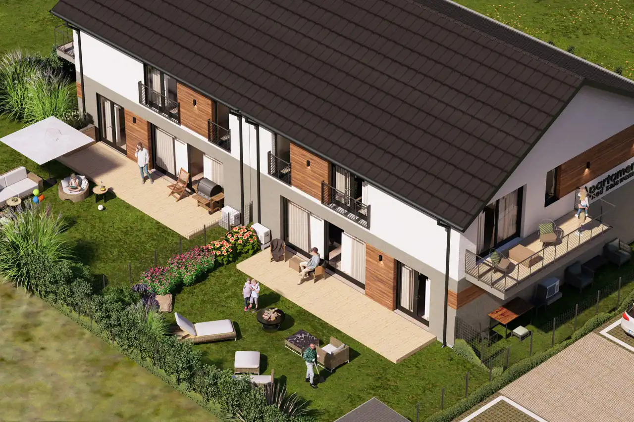 Lokale dostępne są w dwóch wariantach: apartamenty dolne o powierzchni ok. 84 m² z dużymi prywatnymi ogrodami lub apartamenty górne o powierzchni 91,5m² z mniejszymi ogródkami, tarasami oraz dodatkową przestrzenią na strychu. Każdy lokal posiada jedno lub dwa miejsca parkingowe. Można wybrać wygodny apartament dokładnie dopasowany do własnych potrzeb.