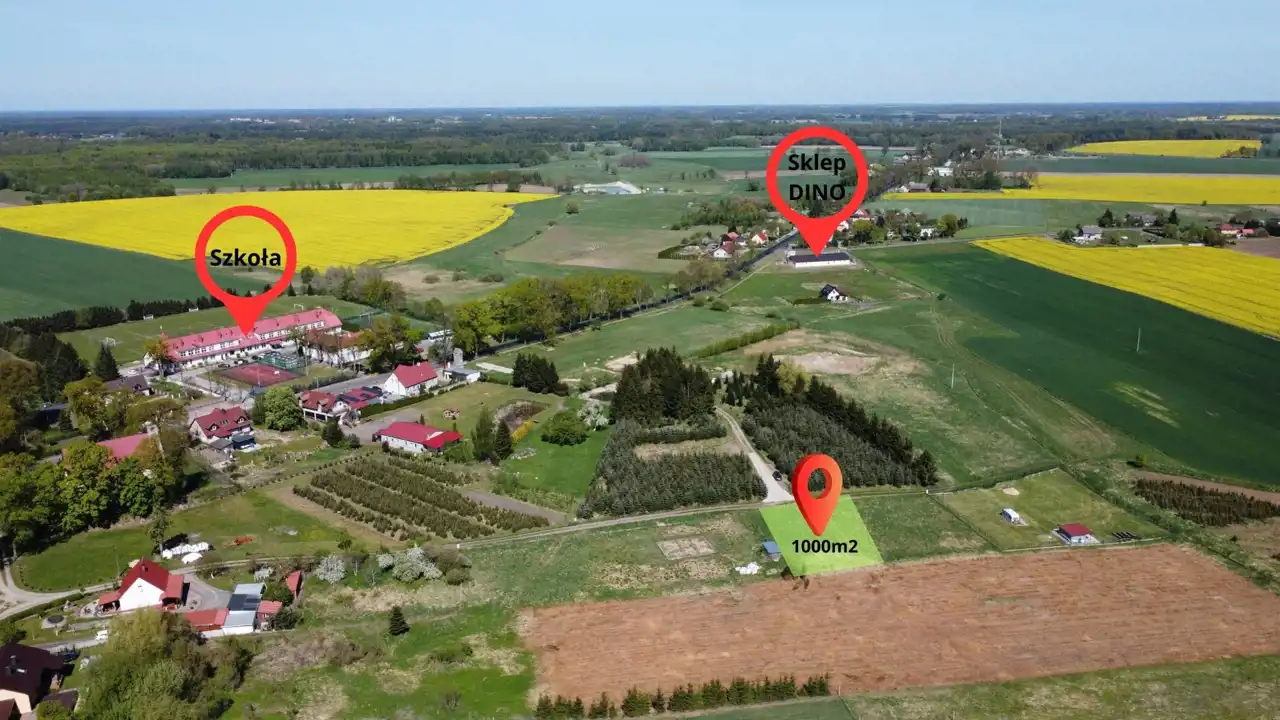 - Powierzchnia: 1000 m² (działka o kształcie zbliżonym do kwadratu), teren płaski.