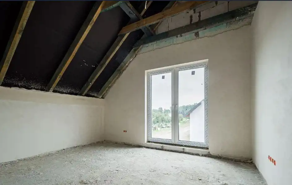 Zbudowany z pustaka, docieplony styropianem wg norm budowlanych, krytyskośnym dachem z blachy.