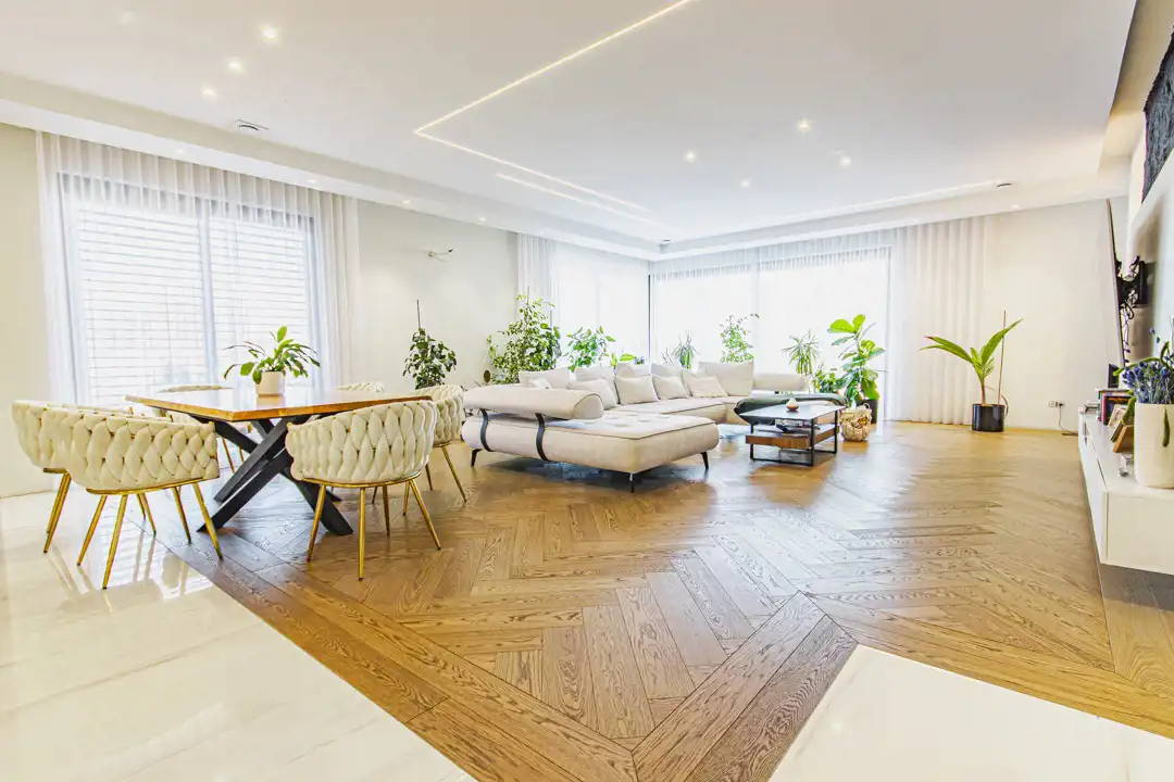 Podłogi wykończone deską drewnianą z kolekcji Experience Maxu Dąb Color Retro z fazą 4-stronną oraz hiszpańskim gresem.