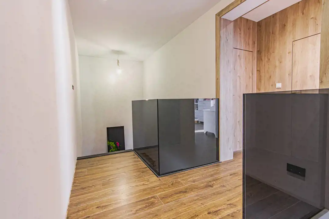 Hol piętra posiada szklane balustrady i połączony jest z parterem dębowymi schodami z podświetleniem LED, które uruchamia się automatycznie na czujnik - stanowią imponujący element wystroju wnętrza.