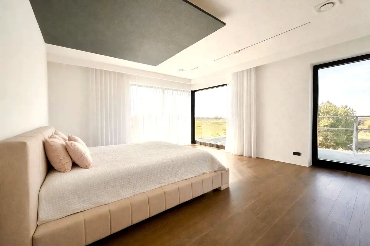 W pomieszczeniach na piętrze również zastosowano narożne przeszklenia dzięki czemu możemy cieszyć się spektakularnymi widokami na otaczającą naturę.