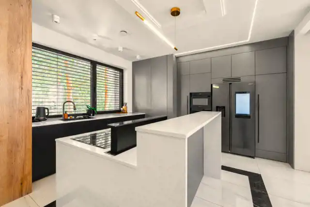 Kuchnia została zaprojektowana z użyciem najwyższej jakości materiałów: spiek kwarcowy, lakierowane na czarny mat fronty, system szuflad ukrytych z otwieraniem Tip-On, sortownik na śmieci wysuwany z System Servo-Drive, zlewozmywak wielofunkcyjny z możliwością instalacji odwróconej osmozy lub saturatora, przygotowany również pod instalacje młynka kuchennego w zabudowie oraz zabudowane sprzęty AGD najlepszych marek.