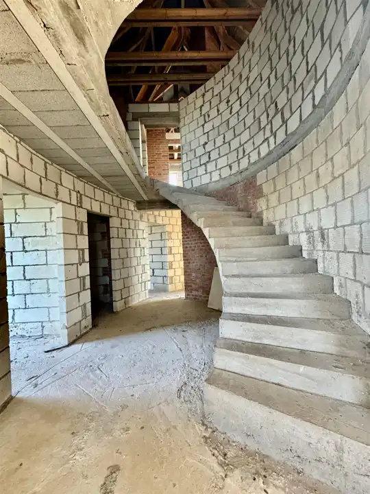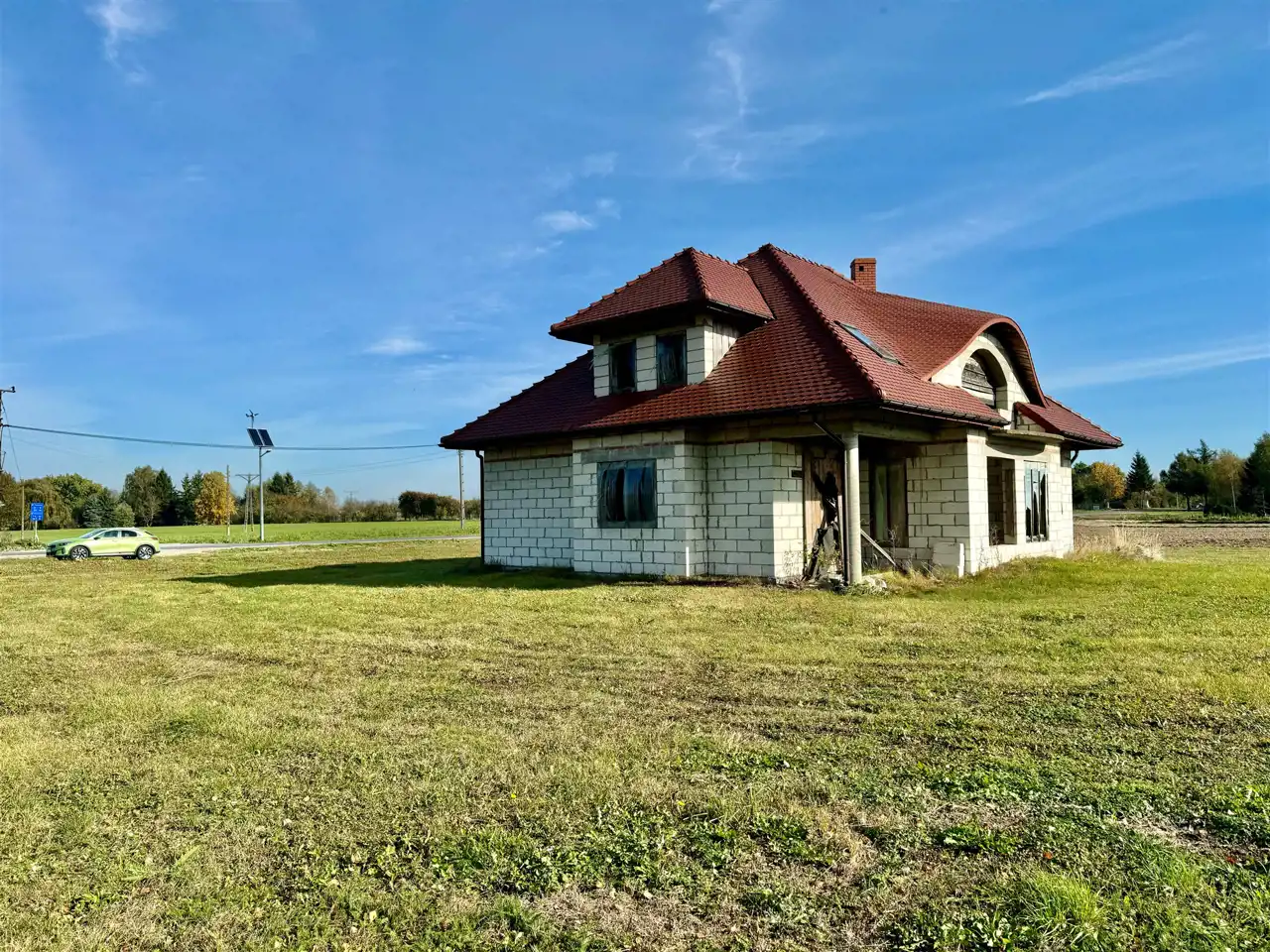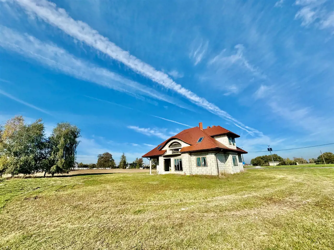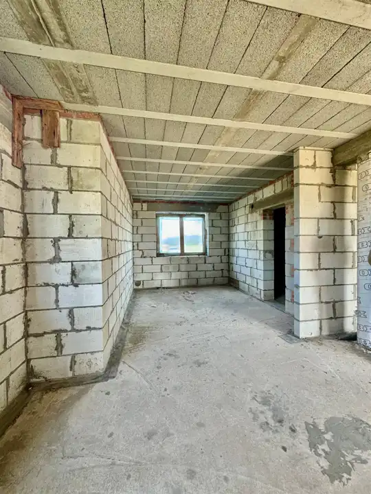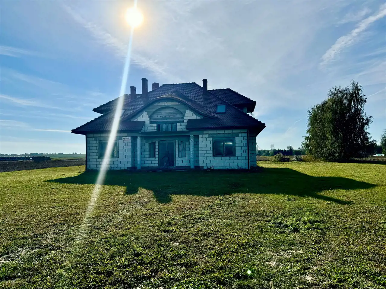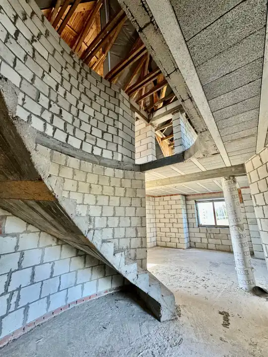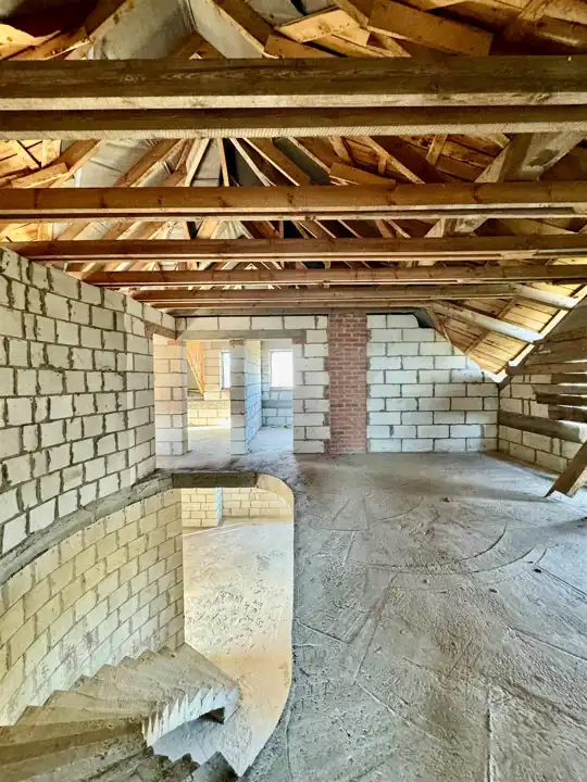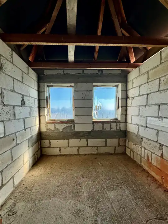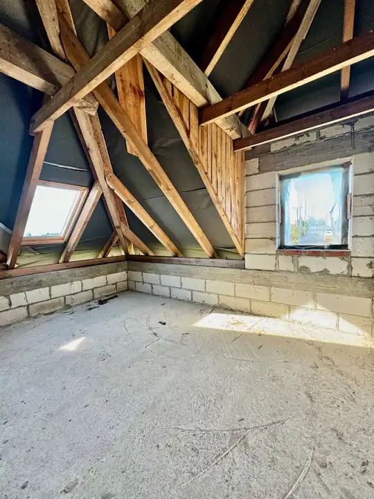 Dom wybudowany do stanu surowego zamkniętego z drzwiami zewnętrznymi i oknami dachowymi.