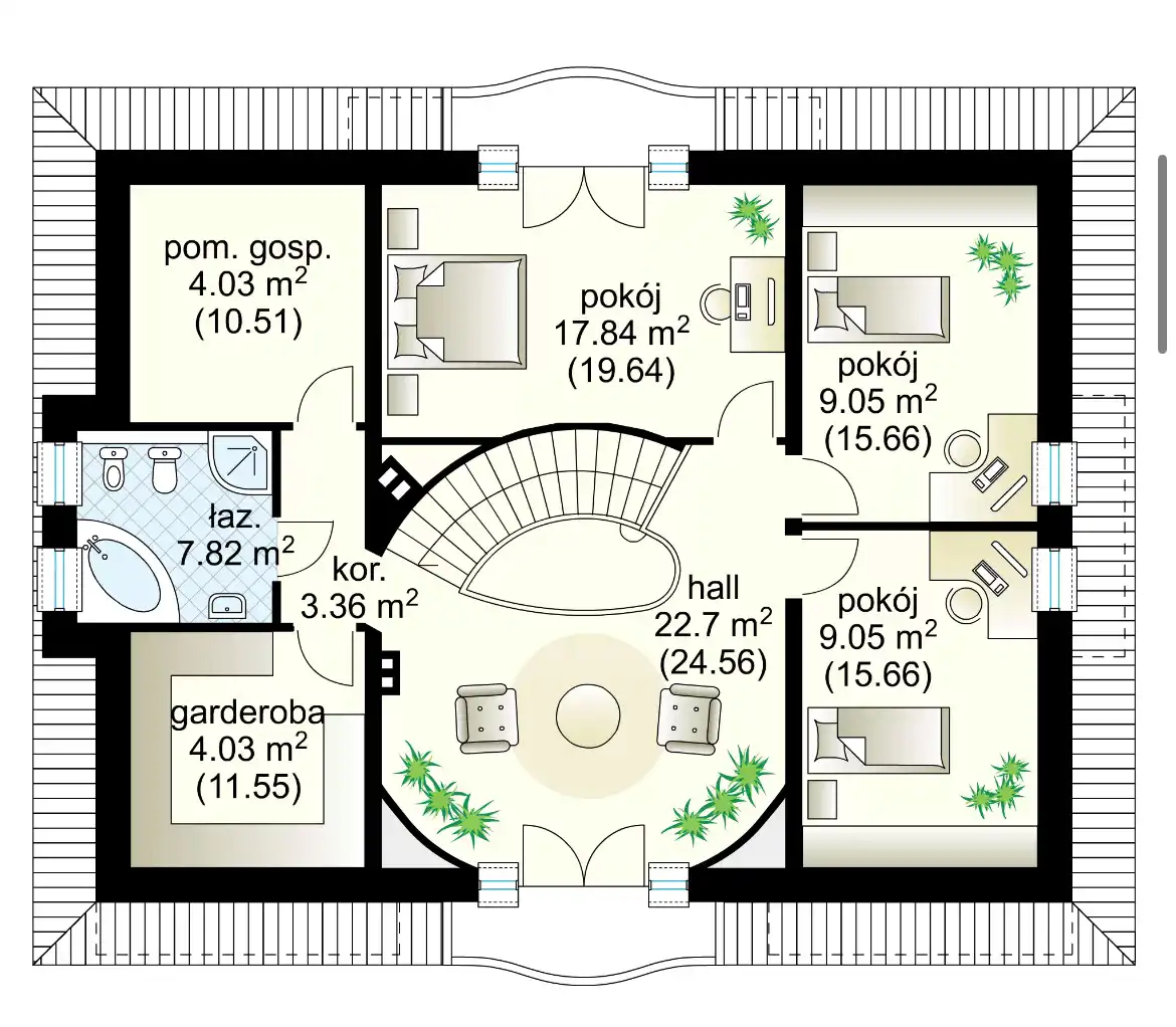 - trzy sypialnie uzupełniają się: łazienką, pomieszczeniem gospodarczym i garderobą,