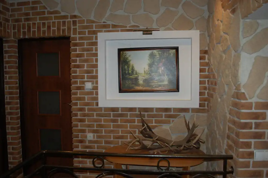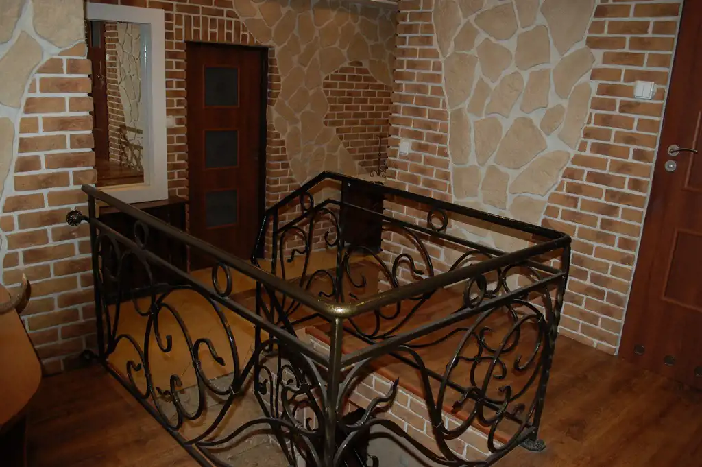 podłodze, na ścianach tynk ozdobny, ozdobna cegła)
