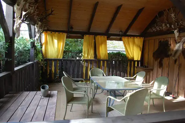 TARAS REKREACYJNY o pow. ok. 30m2, drewniany, na podłodze terakota, całość ogrodzona i zadaszona.