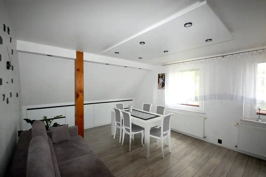 Duży pokój ok. 21,10 m2 - na podłogach panele, ściany gipsowane-malowane i w płytach karton-gips, oświetlenie halogenowe, grzejnik c.o. typu convector, całość uzupełniają i dodają uroku odnowione, drewniane podpory, okno pcv.