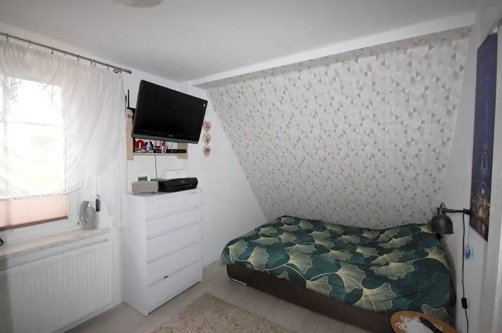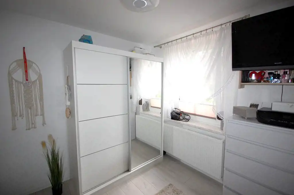 Sypialnia ok. 9,60 m2, podłogi w panelach, ściany płyty karton-gips, tapety, okno pcv, grzejnik c.o. typu convector.