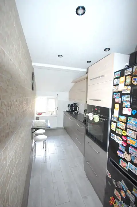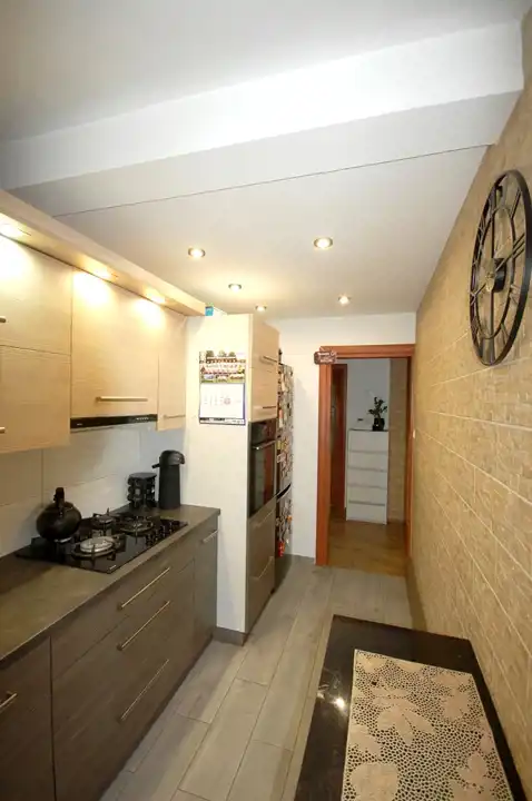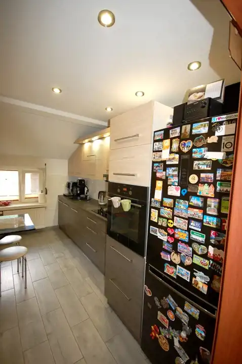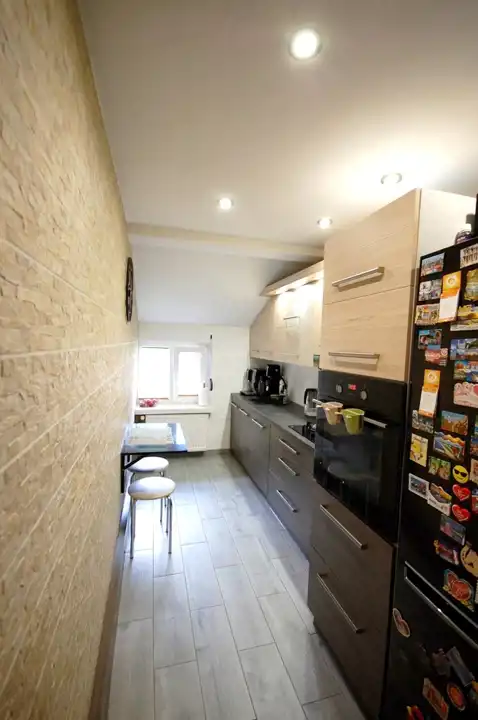 Kuchnia ok .7,40 m2, podłoga wyłożona terakotą, na ścianach glazura, w pełni umeblowana i wyposażona w sprzęt AGD( kuchenka gazowa, pochłaniacz, piekarnik)- całość pozostaje w cenie mieszkania.