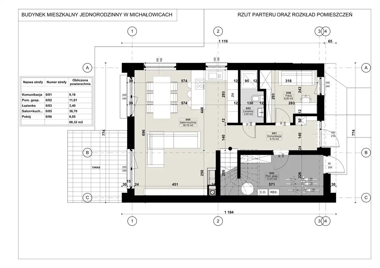 - Salon z aneksem kuchennym i jadalnią 36,70 m2